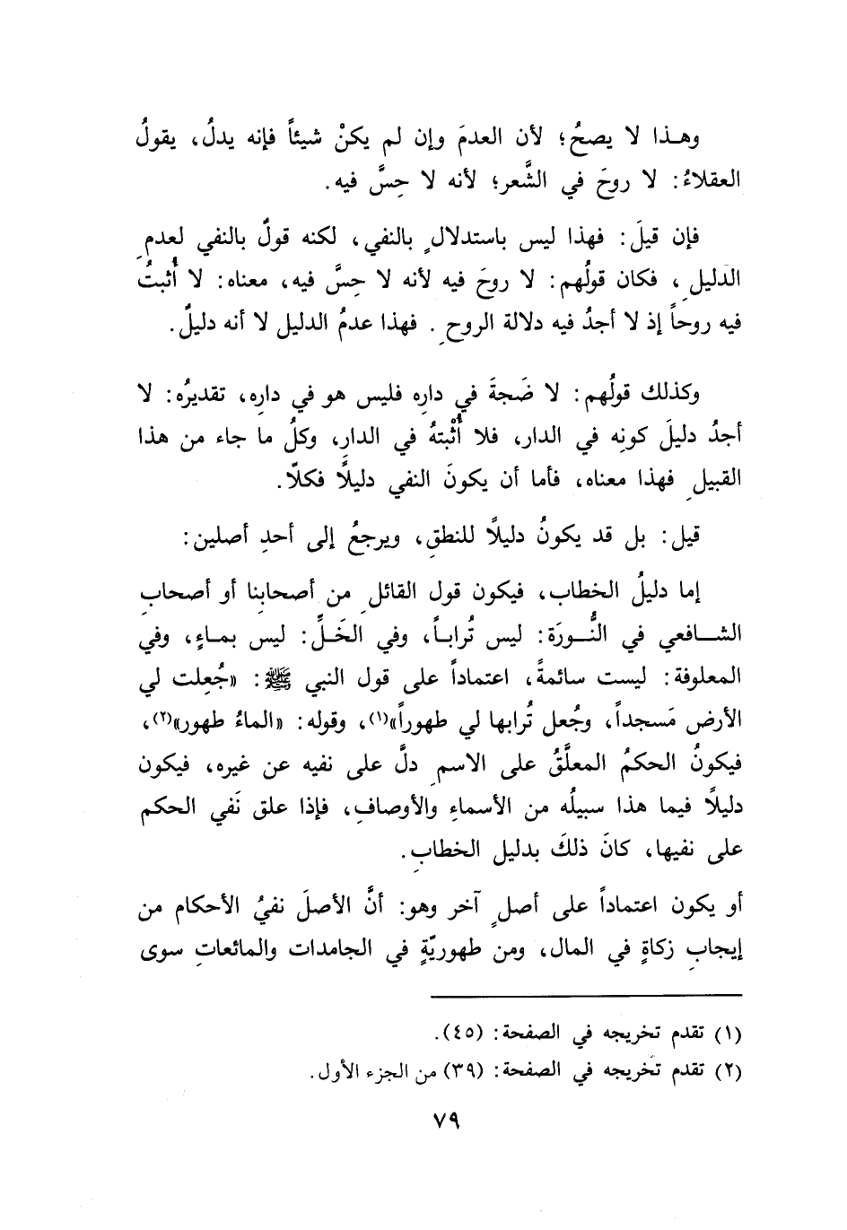 قيل: بل قد يكونُ دليلَاً للنطقِ، ويرجعُ إلى أحدِ أصلين: إمَّا دليلُ الخطاب، فيكون قول القائلِ من أصحابنا أو أصحابِ الشافعي في النُّورَة: ليس تُراباً، وفي الخَل: ليسَ بماءٍ، وفي المعلوفة: ليست سائمةً، اعتماداً على قول النبي - صلى الله عليه وسلم -: "جُعِلت لي الأرض مَسجداً، وجُعل تُرابها لي طهوراً" (١)، وقوله: "الماءُ طهور" (٢)، فيكونُ الحكمُ المعلقُ على الاسمِ دل على نفيه عن غيره، فيكون دليلاً فيما هذا سبيلُه من الأسماءِ والأوصافِ، فإذا علق نَفي الحكم على نفيها، كانَ ذلكَ بدليل الخطابِ.