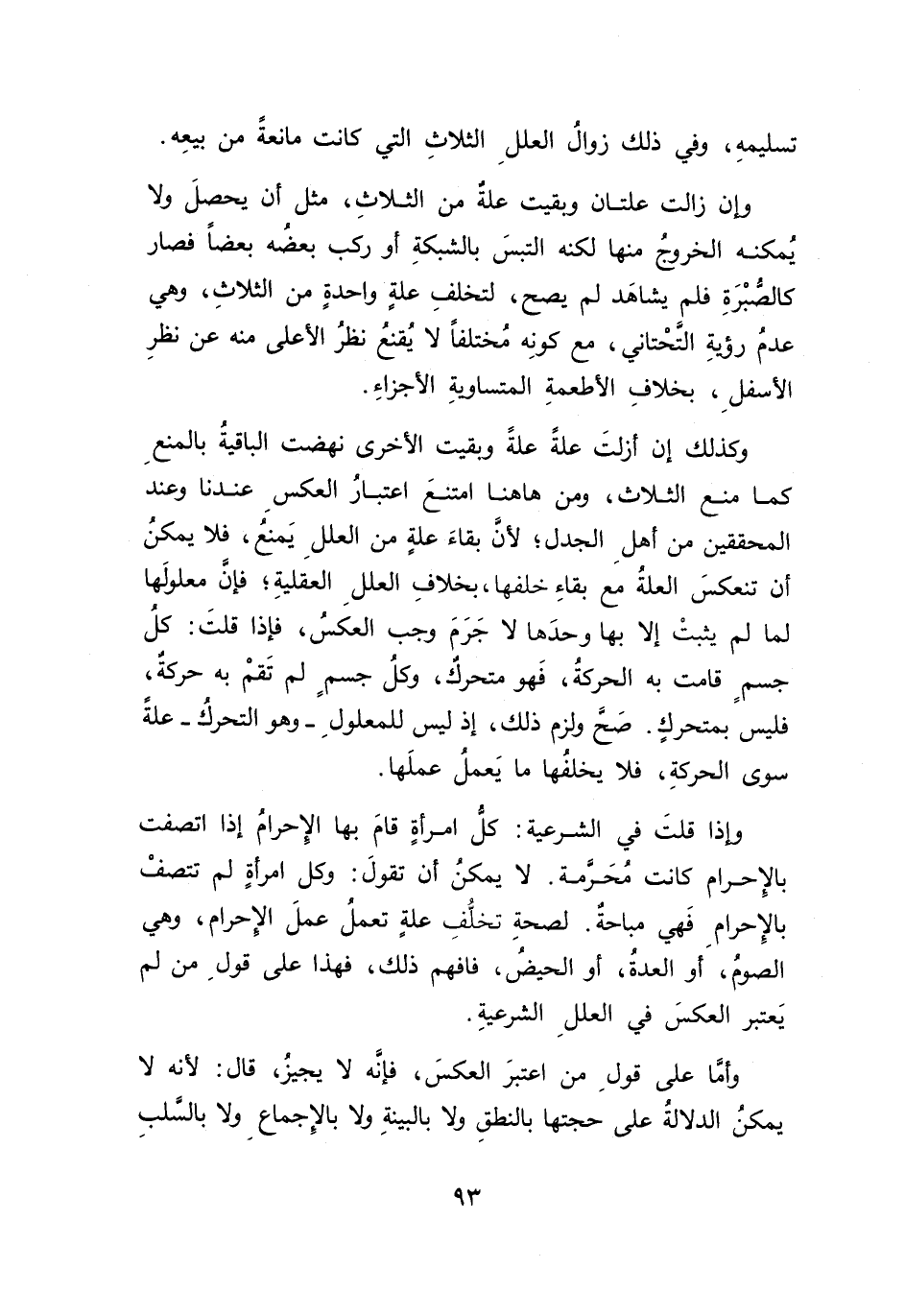 وكذلك إن أزلتَ علَّةُ علةً وبقيت الأخرى نهضت الباقية بالمنعِ كما منع الثلاث، ومن هاهنا امتنعَ اعتبارُ العكسِ عندنا وعند المحققين من أهلِ الجدل؛ لأنَ بقاءَ علة من العللِ يَمنعُ، فلا يمكن أن تنعكسَ العلةُ مع بقاءِ خلفها، بخلافِ العللِ العقليةِ؛ فإنَ معلولَها لما لم يثبتْ إلا بها وحدَها لا جَرَمَ وجب العكس، فإذا قلتَ: كلُّ جسمٍ قامت به الحركةُ، فَهومتحرك، وكل جسمٍ لم تَقمْ به حركة، فليس بمتحركٍ. صَحَّ ولزم ذلك، إذ ليس للمعلولِ -وهو التحرك- علَّةً سوى الحركةِ، فلا يخلفها ما يَعمل عملَها.