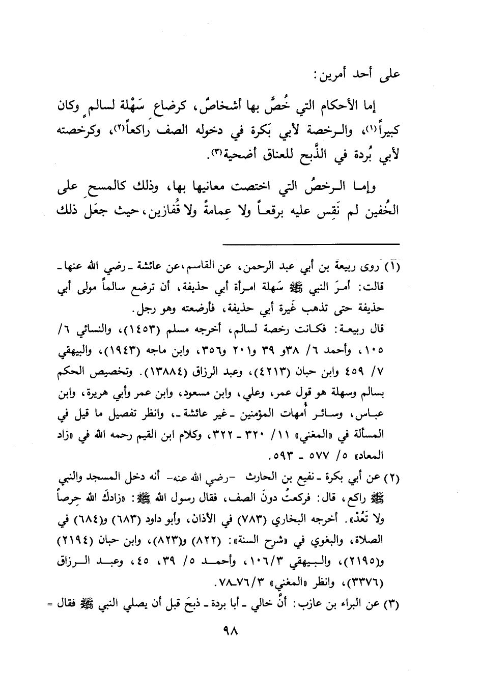 إمَّا الأحكام التي خُص بها أشخاص، كرضاع سَهْلة لسالم وكان كبيراً (١)، والرخصة لأبي بَكرة في دخوله الصف رَاكعاً (٢)، وكرخصته لأبي بُردة في الذَبح للعناق أضحية (٣).