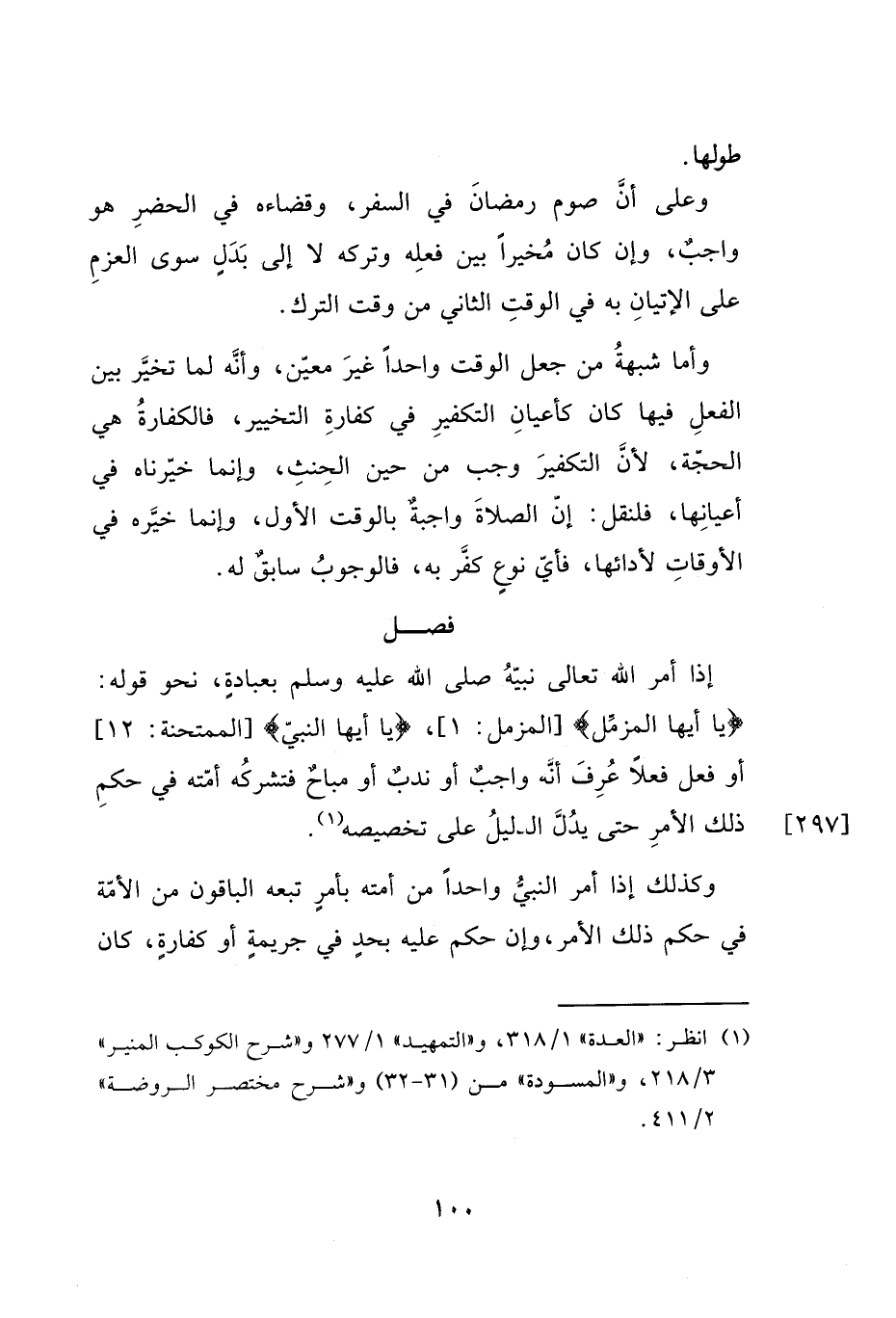وعلى أنَّ صوم رمضانَ في السفر، وقضاءه في الحضرِ هو واجبٌ، وإن كان مُخيراً بين فعلِه وتركه لا إلى بَدَلٍ سوى العزمِ على الإتيانِ به في الوقتِ الثاني من وقت الترك.