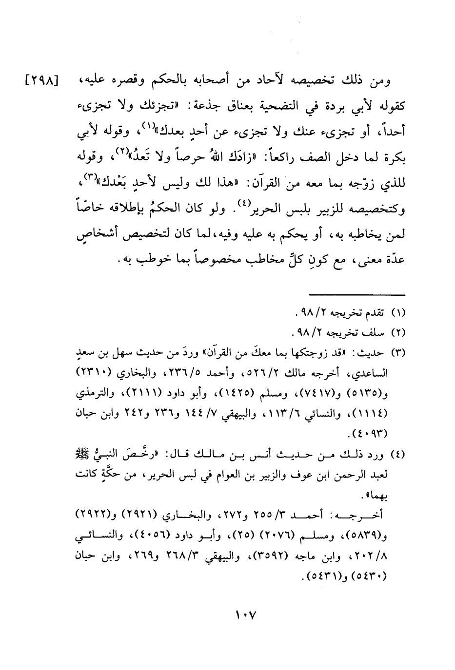 ومن ذلك تخصيصه لآحاد من أصحابه بالحكم وقصره عليه، كقوله لأبي بردة في التضحية بعناق جذعة: "تجزئك ولا تجزىء أحداً، أو تجزىء عنك ولا تجزىء عن أحدٍ بعدك" (١)، وقوله لأبي بكرة لما دخل الصف راكعاً: "زادَك اللهُ حرصاً ولا تَعدُ" (٢)، وقوله للذي زوّجه بما معه من القراَن: "هذا لك وليس لأحدٍ بَعْدك" (٣)، وكتخصيصه للزبير بلبس الحرير (٤). ولو كان الحكمُ بإطلاقه خاصّاً لمن يخاطبه به، أو يحكم به عليه وفيه، لما كان لتخصيص أشخاصٍ عدّة معنى، مع كونِ كل مخاطب مخصوصاً بما خوطب به.