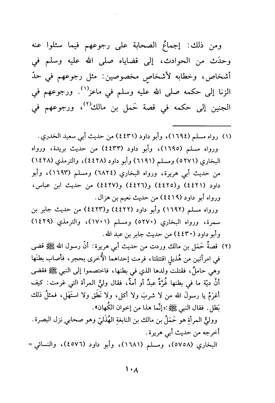 ومن ذلك: إجماعُ الصحابة على رجوعهم فيما سئلوا عنه وحدَث من الحوادث، إلى قضاياه صلى الله عليه وسلم في أشخاص، وخطابه لأشخاص مخصوصين: مثل رجوعهم في حد الزنا إلى حكمه صلى الله عليه وسلم في ماعز (١). ورجوعهم في الجنين إلى حكمه في قصة حَمل بن مالك (٢)، ورجوعهم في