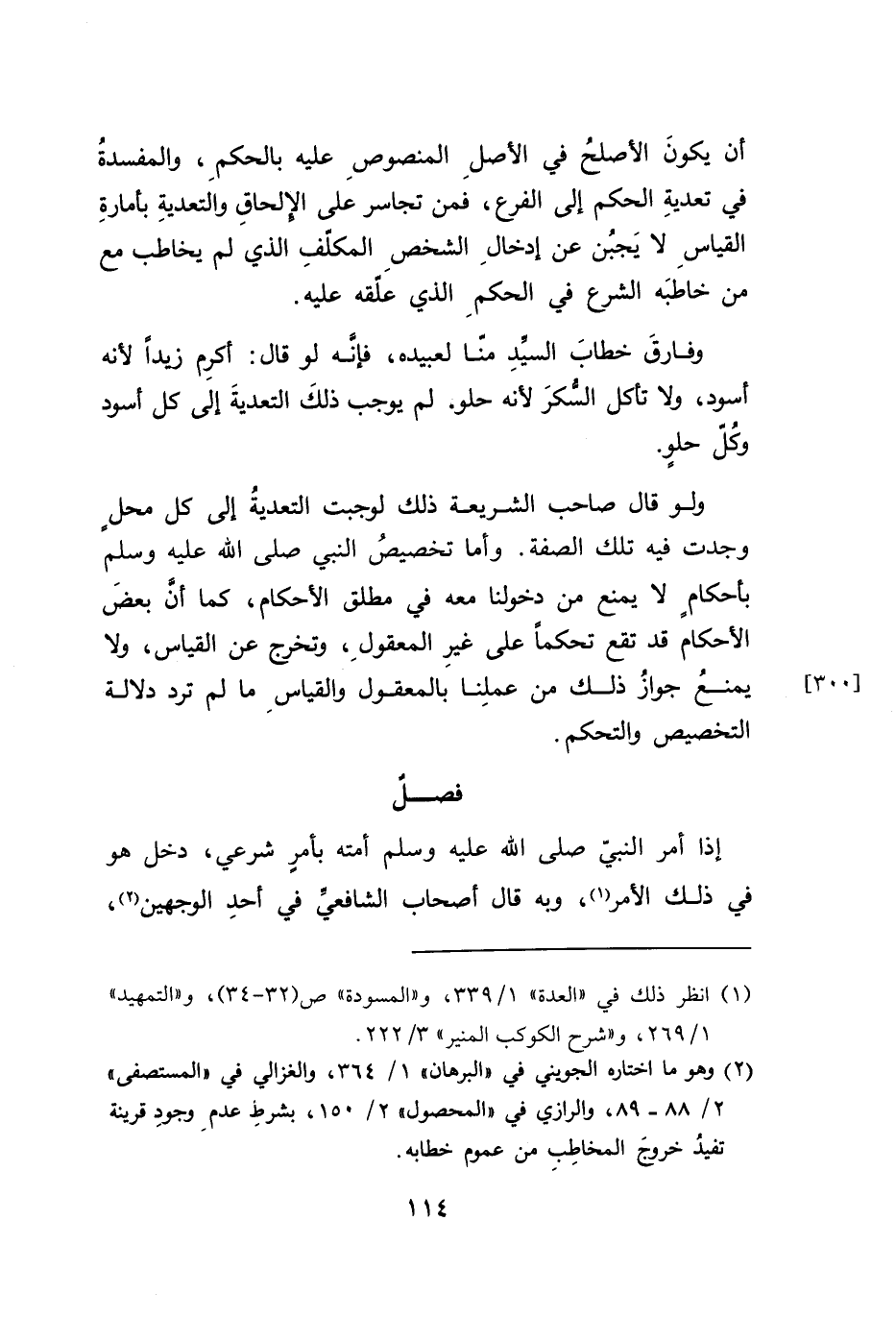 ولو قال صاحب الشريعة ذلك لوجبت التعديةُ إلى كل محلٍ وجدت فيه تلك الصفة. وأما تخصيصُ النبي صلى الله عليه وسلم بأحكامٍ لا يمنع من دخولنا معه في مطلق الأحكام، كما أن بعضَ الأحكام قد تقع تحكماً على غيرِ المعقولِ، وتخرج عن القياس، ولا يمنعُ جوازُ ذلك من عملِنا بالمعقول والقياس ما لم ترد دلالة التخصيص والتحكم.