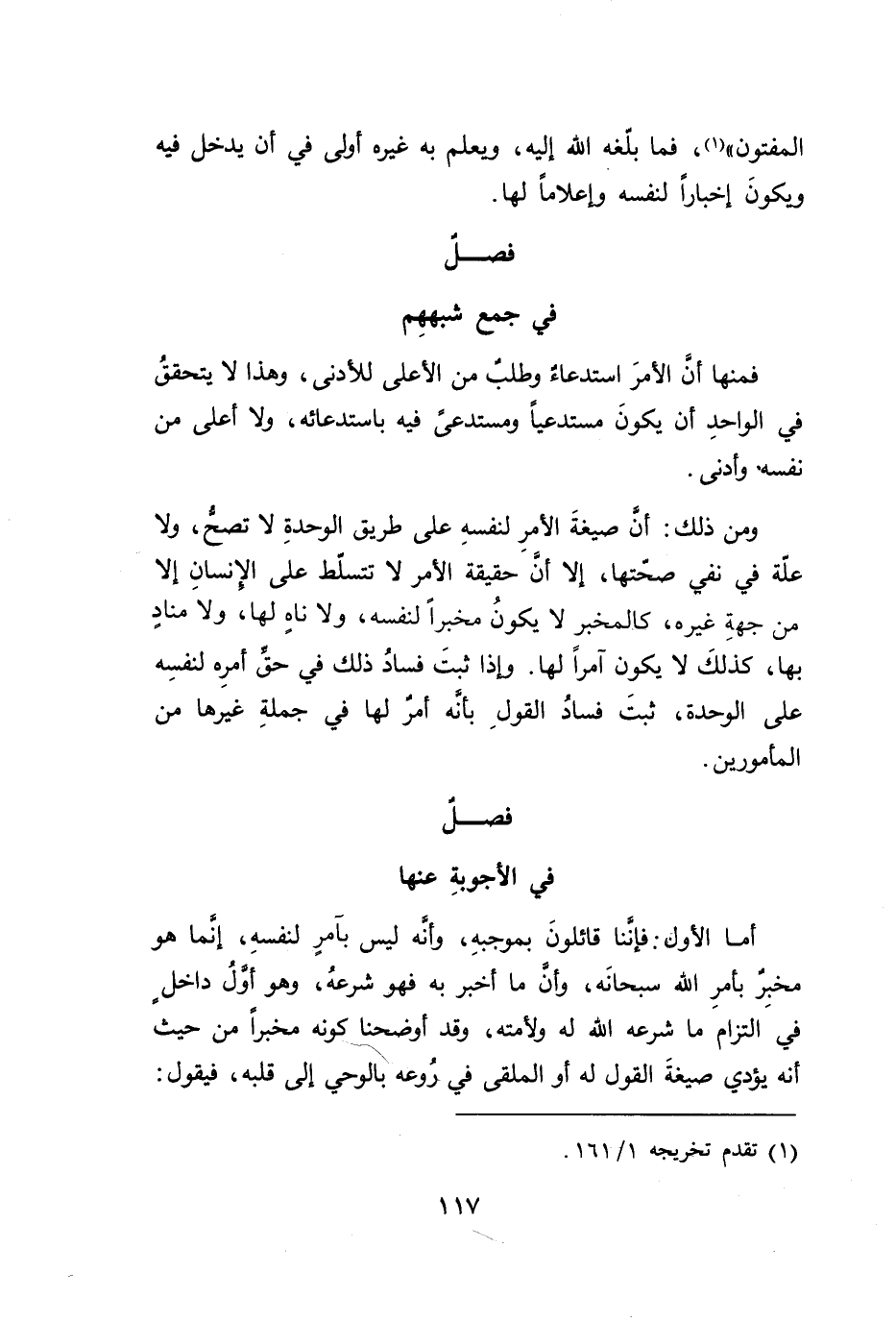 ومن ذلك: أنَّ صيغةَ الأمرِ لنفسهِ على طريق الوحدةِ لا تصحُّ، ولا علّة في نفي صحّتها، إلا أنَ حقيقة الأمر لا تتسلط على الأنسانِ إلا من جهةِ غيره، كالمخبر لا يكونُ مخبراً لنفسه، ولا ناهٍ يها، ولا منادٍ بها، كذلكَ لا يكون آمراً لها. وإذا ثبتَ فسادُ ذلك في حق أمرِه لنفسِه على الوحدة، ثبتَ فسادُ القولِ بأنه أمرٌ لها في جملةِ غيرها من المأمورين.