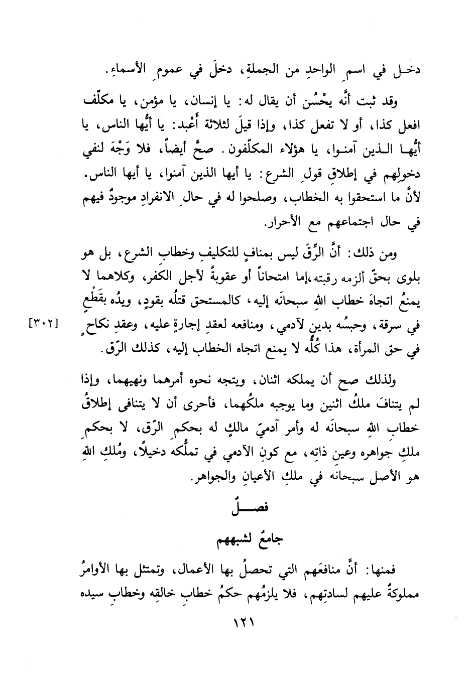 ولذلك صح أن يملكه اثنان، ويتجه نحوه أمرهما ونهيهما، واذا لم يتنافَ ملكُ اثنين وما يوجبه ملكُهما، فأحرى أن لا يتنافى إطلاقُ خطاب اللهِ سبحانَه له وأمر آدميّ مالكٍ له بحكمِ الرّق، لا بحكمِ ملكِ جَواهره وعينِ ذاتِه، مع كونِ الآدمي في تملّكه دخيلًا، ومُلكِ اللهِ هو الأصل سبحانه في ملكِ الأعيانِ والجواهر.
