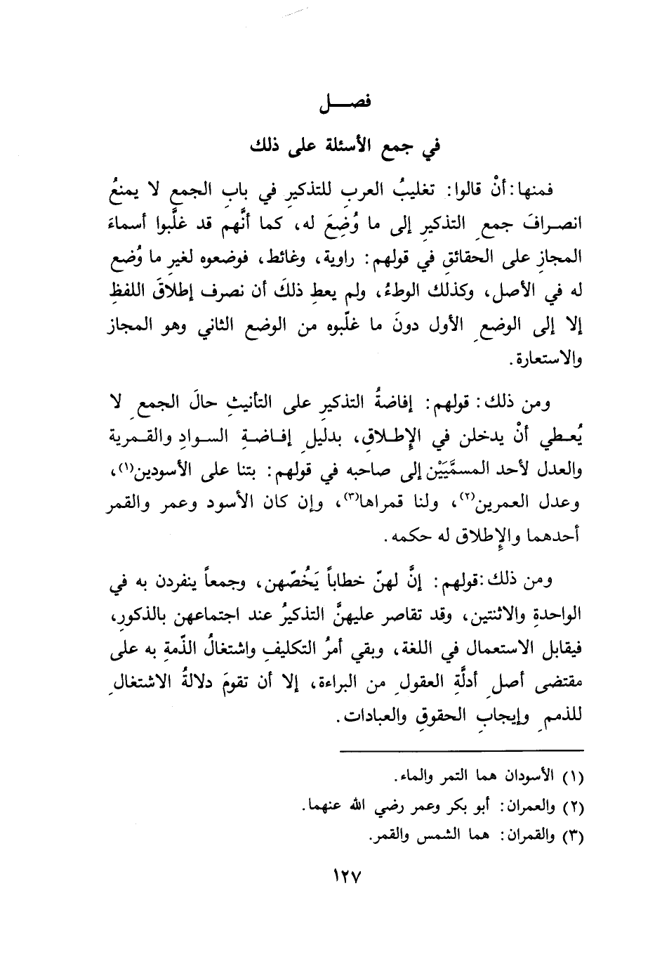ومن ذلك: قولهم: إفاضةُ التذكيرِ على التانيثِ حالَ الجمع لا ئعطي أنْ يدخلن في الِإطلاقِ، بدليلِ إفاضةِ السوادِ والقمَرية والعدل لأحد المسميَيْن إلى صاحبه في قولهم: بتنا على الأسودين (١)، وعدل العمرين (٢)، ولنا قمراها (٣)، وإن كان الأسود وعمر والقمر أحدهما والِإطلاق له حكمه.