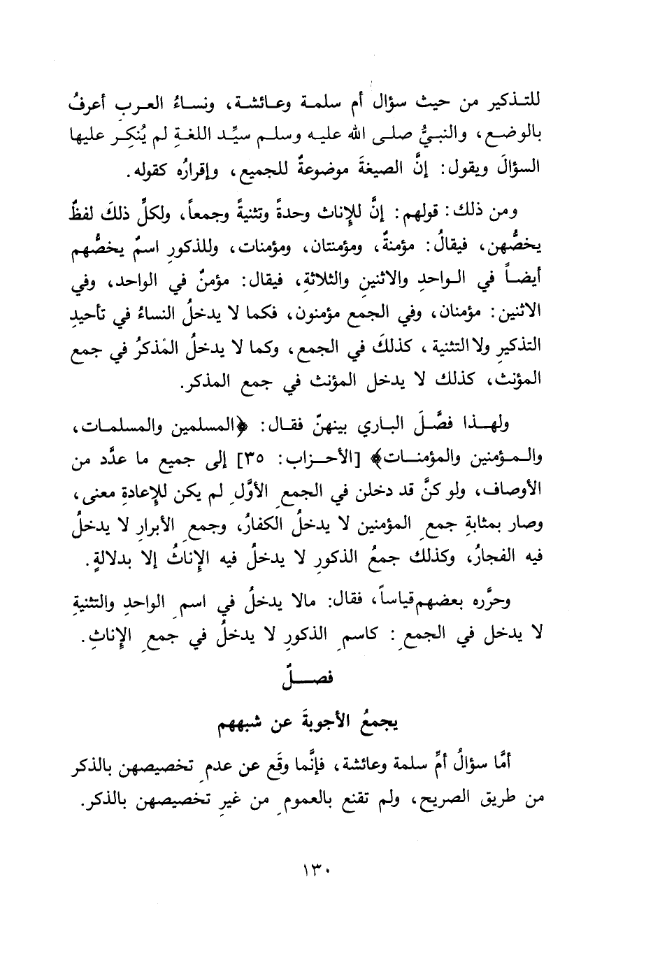 ولهذا فصَّلَ الباري بينهنّ فقال: {إِنَّ الْمُسْلِمِينَ وَالْمُسْلِمَاتِ وَالْمُؤْمِنِينَ وَالْمُؤْمِنَاتِ} [الأحزاب: ٣٥] إلى جميع ما عدَّد من الأوصاف، ولو كنَ قد دخلن في الجمعِ الأولِ لم يكن للإعادةِ معنى، وصار بمثابةِ جمعِ المؤمنين لا يدخل الكفارُ، وجمعِ الأبرارِ لا يدخل فيه الفجارُ، وكذلك جمعُ الذكورِ لا يدخل فيه الِإناثُ إلا بدلالةٍ.
