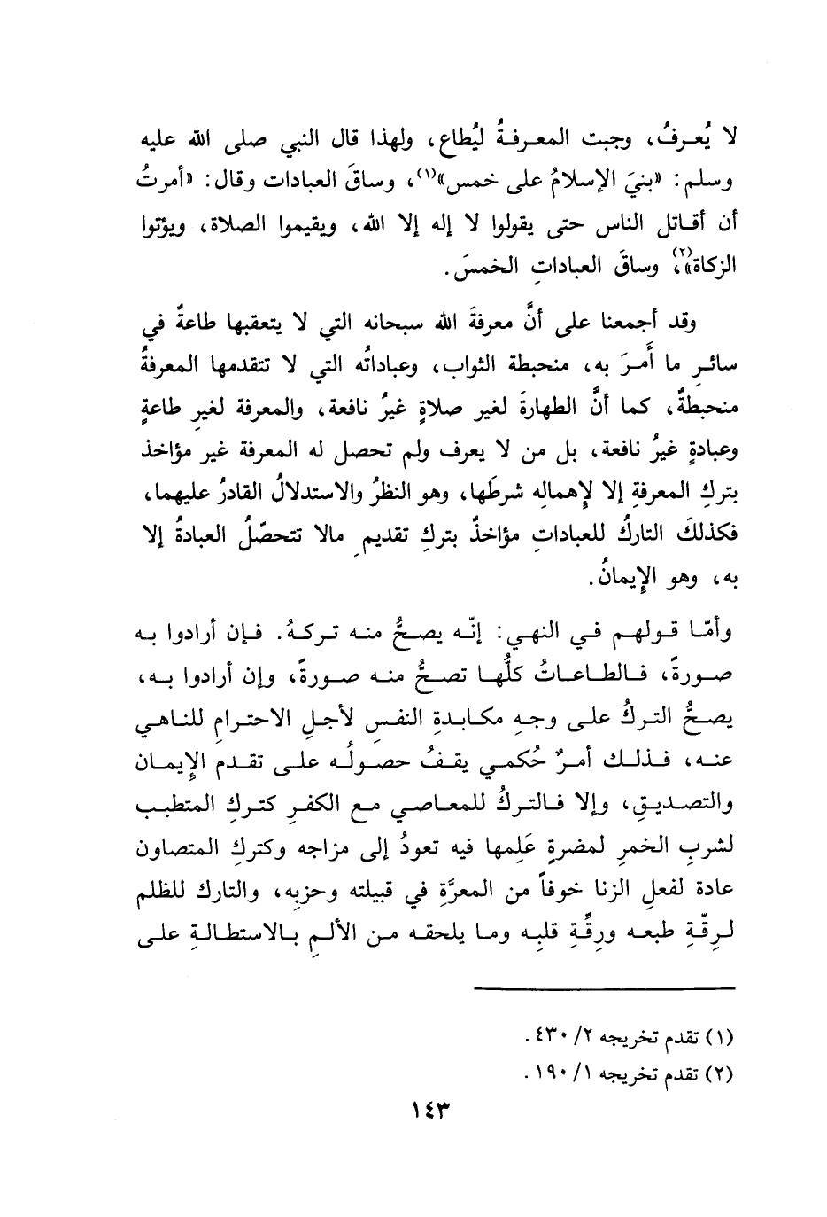 وقد أجمعنا على أنَ معرفةَ الله سبحانه التي لا يتعقبها طاعة في سائرِ ما أَمرَ به، منحبطة الثواب، وعباداتُه التي لا تتقدمها المعرفة منحبطةٌ، كما أنَّ الطهارةَ لغير صلاةٍ غيرُ نافعة، والمعرفة لغيرِ طاعةٍ وعبادةٍ غيرُ نافعة، بل من لا يعرف ولم تحصل له المعرفة غير مؤاخذ بتركِ المعرفةِ إلا لإهمالِه شرطَها، وهو النظرُ والاستدلالُ القادرُ عليهما، فكذلكَ التاركُ للعباداتِ مؤاخذٌ بتركِ تقديمِ مالا تتحصّلُ العبادةُ إلا به، وهو الإيمانُ.