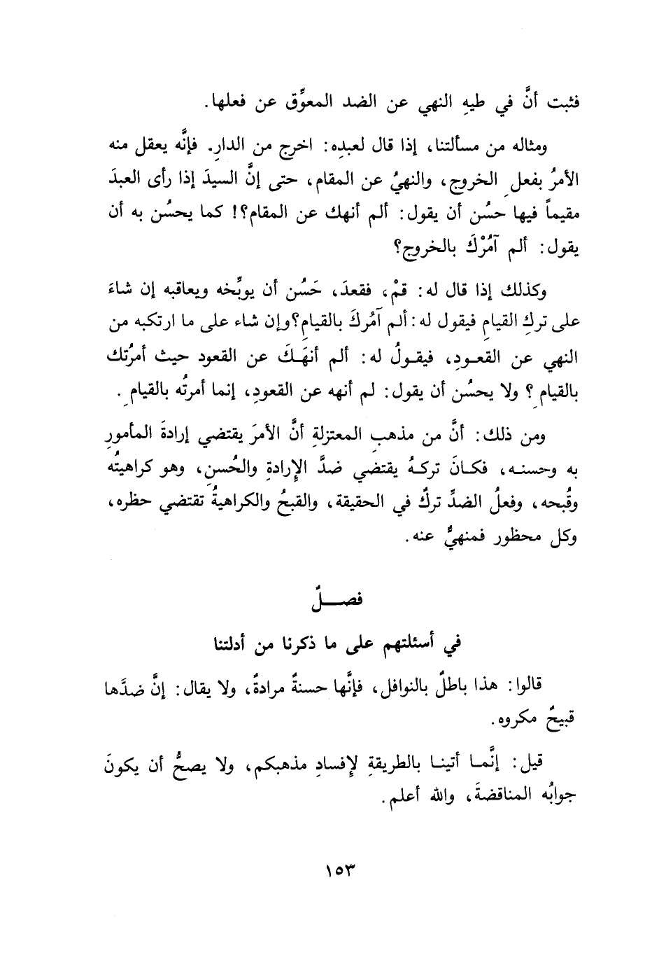 وكذلك إذا قال له: قمْ، فقعدَ، حَسُن أن يوبِّخه ويعاقبه إن شاءَ على تركِ القيامِ فيقول له: ألم اَمُركَ بالقيامِ؟ وإن شاء على ما ارتكبه من النهي عن القعودِ، فيقولُ له: ألم أنهَكَ عن القعود حيث أمرُتك بالقيامِ؟ ولا يحسُن أن يقول: لم أنهه عن القعودِ، إنما أمرتُه بالقيامِ.