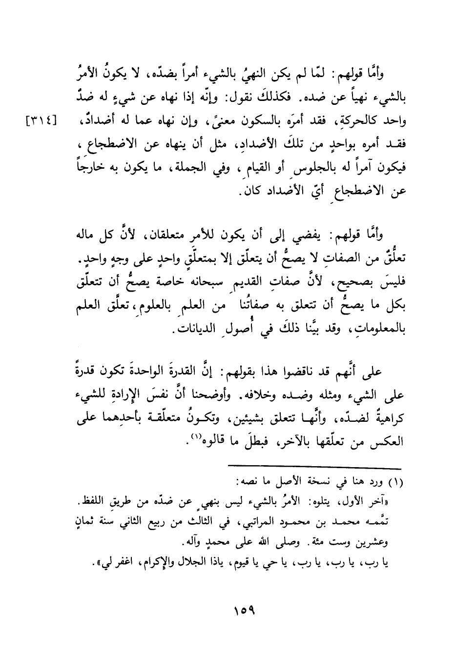 على أنَهم قد ناقضوا هذا بقولهم: إنَ القدرةَ الواحدةَ تكون قدرةً على الشيء ومثله وضده وخلافه. وأوضحنا أنَّ نفسَ الِإرادةِ للشيء كراهيةٌ لضدّه، وأنها تتعلق بشيئين، وتكونُ متعلّقة بأحدِهما على العكس من تعلّقها بالآخر، فبطلَ ما قالوه (١).
