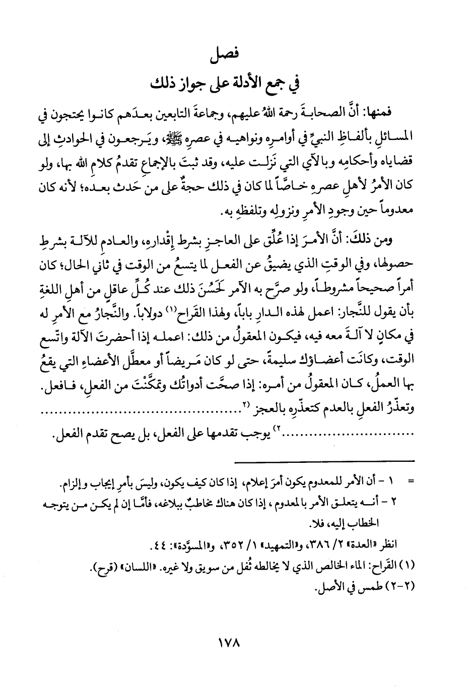 ومن ذلكَ: أنَ الأمرَ إذا عُلق على العاجزِ بشرط إِقْداره، والعادمِ للآلة بشرطِ حصولها، وفي الوقتِ الذي يضيقُ عن الفعل لما يتسعُ من الوقت في ثاني الحال؛ كان أمراً صحيحاً مشروطاً، ولو صرح به الآمر لَحَسُنَ ذلك عند كُلِّ عاقلٍ من أهلِ اللغةِ بأن يقول للنَجار اعمل لهذه الدارِ باباً، ولهذا القَراح (١) دولاباً. والنَجارُ مع الأمرِ له في مكانٍ لا آلةَ معه فيه، فيكون المعقولُ من ذلك: اعمله إذا أحضرتَ الآلة واتّسع الوقت، وكانَت أعضاؤك سليمةً، حتى لو كان مَريضاً أو معطَّل الأعضاءِ التي يقعُ بها العملُ، كان المعقولُ من أمره: إذا صحَت أدواتُك وتمكَنْتَ من الفعلِ، فافعل. وتعذّرُ الفعلِ بالعدم كتعذّرِه بالعجز (٢ ......................................... ٢ ..............................) يوجب تقدمها على الفعل، بل يصح تقدم الفعل.