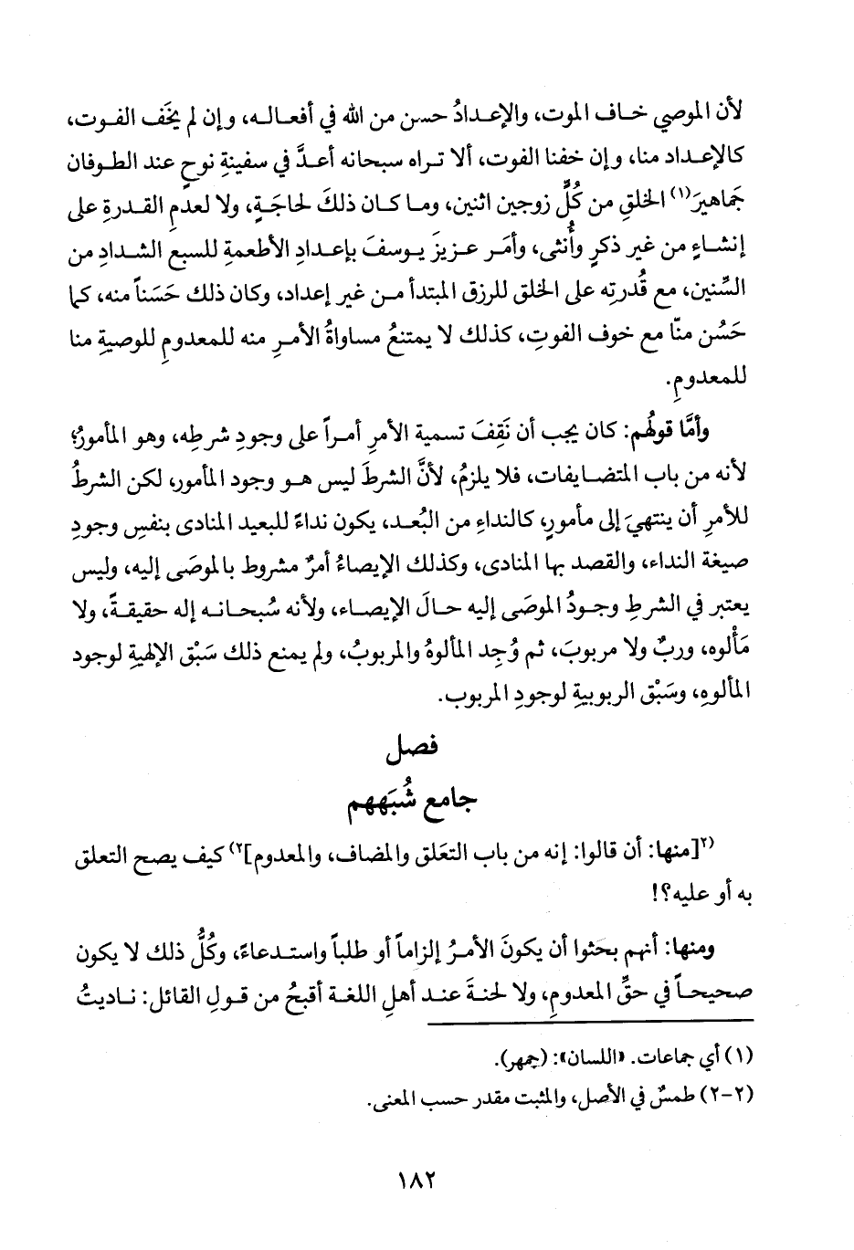 وأما قولُهم: كان يجب أن نَقِفَ تسمية الأمرِ أمراً على وجودِ شرطِه، وهو المأمورُ؛ لأنه من باب المتضايفات، فلا يلزمُ، لأنَ الشرطَ ليس هو وجود المأمور لكن الشرطُ للأمرِ أن ينتهيَ إلى مأمورٍ كالنداءِ من البُعد، يكون نداءً للبعيد المنادى بنفسِ وجودِ صيغة النداء، والقصد بها المنادى، وكذلك الإيصاءُ أمرٌ مشروط بالموصَى إليه، وليس يعتبر في الشرطِ وجودُ الموصَى إليه حالَ الإيصاء، ولأنه سُبحانه إله حقيقةً، ولا مَأْلوه، وربٌ ولا مربوبَ، ثم وُجِد المألوهُ والمربوبُ، ولم يمنع ذلك سَبْق الإلهية لوجود المألوه، وسَبْق الربوبية لوجودِ المربوب.