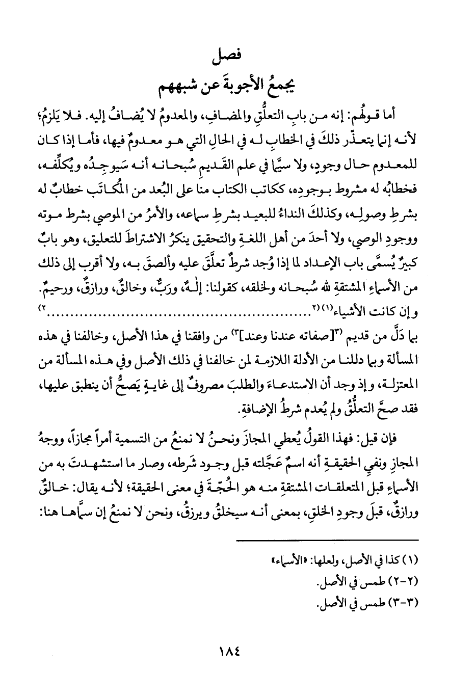 أما قولُهم: إنه من بابِ التعلقِ والمضافِ، والمعدومُ لا يُضافُ إليه. فلا يَلزمُ؛ لأنه إنما يتعذّر ذلكَ في الخطابِ له في الحالِ التي هو معدوم فيها، فأمَّا إذا كان للمعدوم حال وجودٍ، ولا سيما في علم القَديمِ سُبحانه أنه سَيوجِدُه ويُكلِّفه، فخطابُه له مشروط بوجودِه، ككاتب الكتاب منا على البُعد من المُكاتَب خطابٌ له بشرطِ وصوله، وكذلكَ النداءُ للبعيد بشرطِ سماعه، والأمرُ من الموصي بشرط موته ووجودِ الوصي، ولا أحدَ من أهل اللغةِ والتحقيق ينكرُ الاشتراطَ للتعليق، وهو بابٌ كبيرٌ يُسمَّى باب الإعداد لما إذا وُجد شرط تعلَّقَ عليه وألصقَ به، ولا أقرب إلى ذلك من الأسماءِ المشتقةِ لله سُبحانه ولخلقه، كقولنا: اله ورَب، وخالق، ورازق، ورحيم.