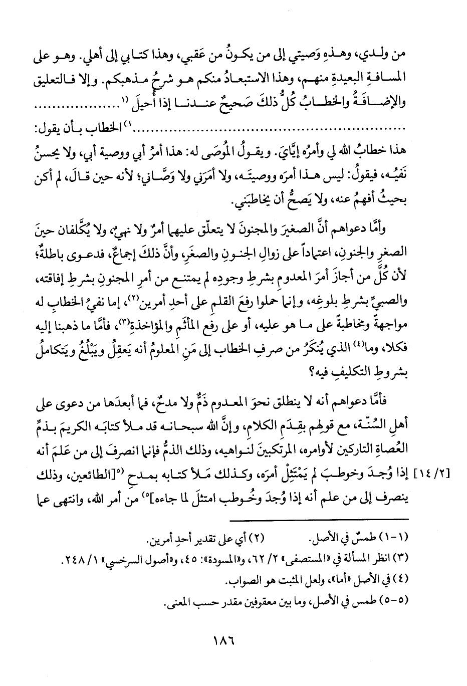 وأمَّا دعواهم أنَّ الصغيرَ والمجنونَ لا يتعلّق عليهما أمرٌ ولا نهيٌ، ولا يُكَّلفان حينَ الصغرِ والجنونِ، اعتماداً على زوالِ الجنونِ والصغَرِ، وأنَّ ذلكَ إجماعٌ، فدعوى باطلةٌ؛ لأن كُلَّ من أجازَ أمرَ المعدومِ بشرطِ وجودِه لم يمتنع من أمرِ المجنونِ بشرطِ إفاقته، والصبيِّ بشرطِ بلوغِه، وإنما حملوا رفعَ القلمِ على أحدِ أمرين (٢)، إما نفيُ الخطابِ له مواجهةً ومخاطبةً على ما هو عليه، أو على رفع المأثَمِ والمؤاخذةِ (٣)، فأمَّا ما ذهبنا إليه فكلا، وما (٤) الذي يُنكَرُ من صرفِ الخطاب إلى مَنِ المعلومُ أنه يَعقِلُ ويَبْلُغُ ويَتكاملُ بشروطِ التكليفِ فيه؟