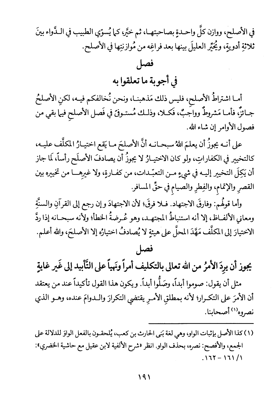 أما اشتراطُ الأصلحِ، فليس ذلك مَذهبنا، ونحن نُخالفكم فيه، لكنِ الأصلحُ جائزٌ, فأما مَشروطٌ وواجبٌ، فكلا، وذلك مُستوفىَ في فَصل الأصلحِ فيما بقي من فصول الأوامر إن شاء الله.