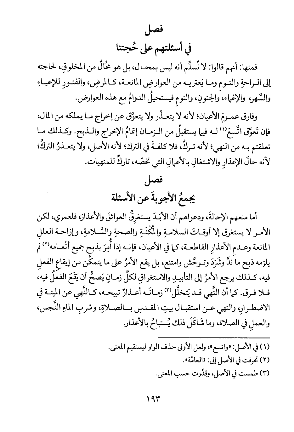 أما منعهم الإحالةَ، ودعواهم أن الأبدَ يستغرِقُ العوائقَ والأعذار فلعمري، لكن الأمر لا يستغرق إلا أوقاتَ السلامةِ والمُكْنَةِ والصحةِ والسلامةِ، وإزاحة العللِ المانعة وعدمِ الأعذارِ القاطعة، كما في الأعيان، فإنه إذا أمِرَ بذبح جميع أنْعامه (٢) لم يلزمه ذبح ما ندَّ وشَرَدَ وتوحَّش وامتنع، بل يقع الأمرُ على ما يتمكَن من إيقاعِ الفعلِ فيه، كذلك يرجع الأمرُ إلى التأبيدِ والاستغراقِ لكلِّ زمانٍ يَصحُّ أن يَقَعَ الفعلُ فيه، فلا فرق. كما أن النَّهي قد يَتخلَّل (٣) زمانَه أعذارٌ تبيحه، كالنَّهي عن الميتة في الاضطرار والنهي عن استقبال بيتِ المقدسِ بالصلاةِ، وشربِ الماءِ النَّجس، والعملِ في الصلاة، وما شَاكَلَ ذلك يُستباحُ بالأعذار