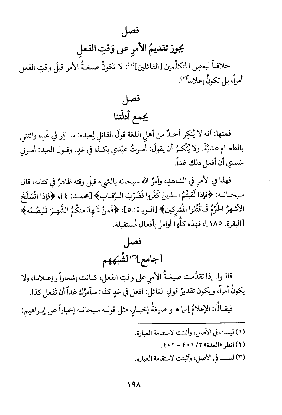 خلافاً لبعضِ المتكلَمين [القائلين] (١): لا تكونُ صيغةُ الأمر قبلَ وقتِ الفعل أمراً، بل تكونُ إعلاماً (٢).