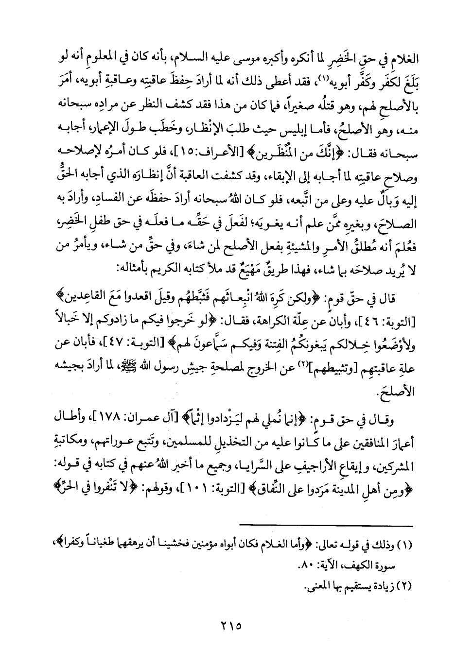 قال في حقّ قومٍ: {وَلَكِنْ كَرِهَ اللَّهُ انْبِعَاثَهُمْ فَثَبَّطَهُمْ وَقِيلَ اقْعُدُوا مَعَ الْقَاعِدِينَ} [التوبة: ٤٦]، وأبان عن عِلّة الكراهة، فقال: {لَوْ خَرَجُوا فِيكُمْ مَا زَادُوكُمْ إِلَّا خَبَالًا وَلَأَوْضَعُوا خِلَالَكُمْ يَبْغُونَكُمُ الْفِتْنَةَ وَفِيكُمْ سَمَّاعُونَ لَهُمْ} [التوبة: ٤٧]، فأبان عن علةِ عاقبتهِم [وتثبيطهم] (٢) عن الخروج لمصلحةِ جيشِ رسول الله صلى الله عليه وسلم، لما أرادَ بجيشه الأصلحَ.