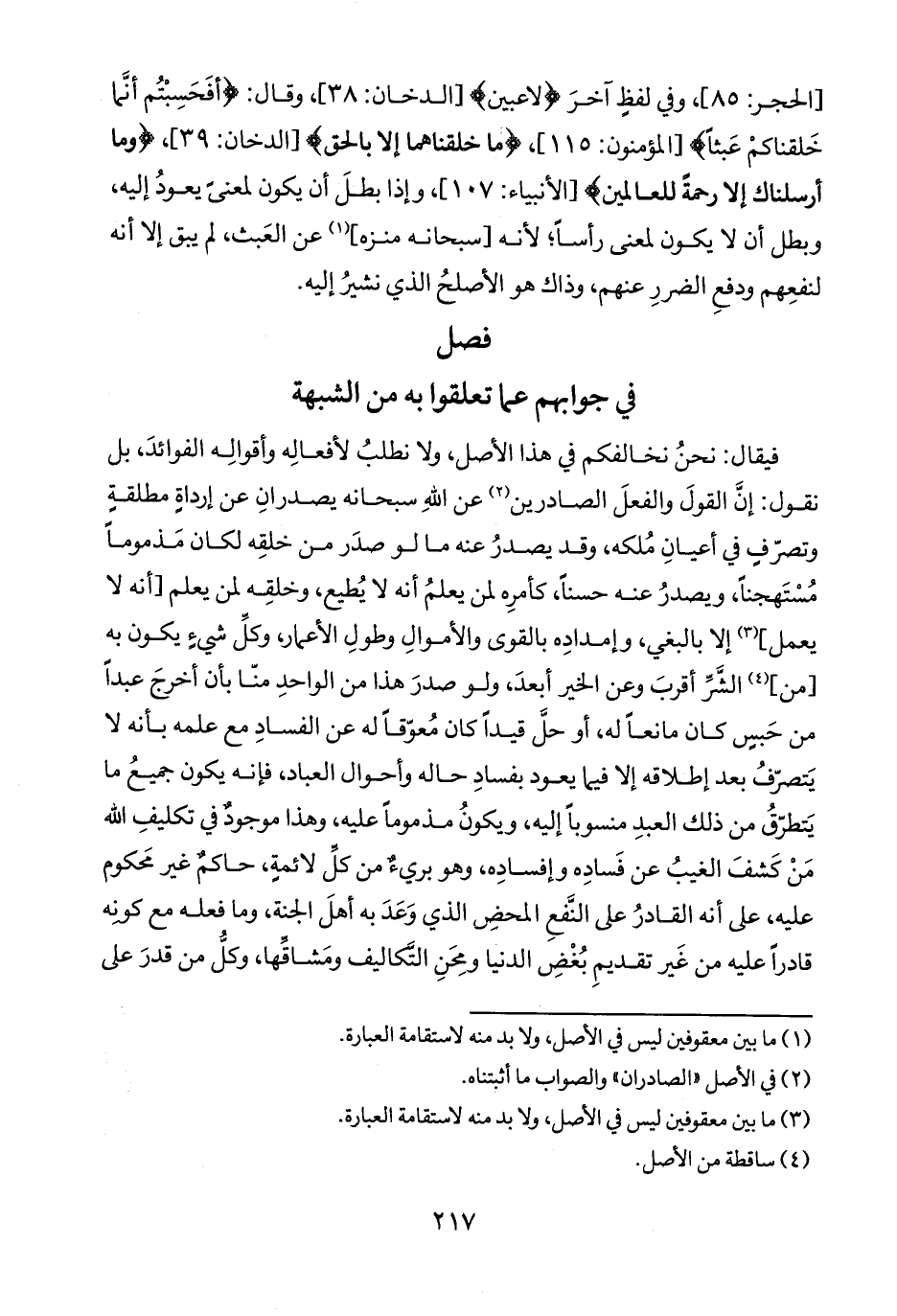 [الحجر ٨٥]، وفي لفظٍ آخرَ {لاعبين} [الدخان: ٣٨]، وقال: {أَفَحَسِبْتُمْ أَنَّمَا خَلَقْنَاكُمْ عَبَثًا} [المؤمنون: ١١٥]، {مَا خَلَقْنَاهُمَا إِلَّا بِالْحَقّ} [الدخان: ٣٩]، {وَمَا أَرْسَلْنَاكَ إِلَّا رَحْمَةً لِلْعَالَمِينَ (١٠٧)} [الأنبياء: ١٠٧]، وإذا بطلَ أن يكون لمعنىً يعودُ إليه، وبطل أن لا يكون لمعنى رأساً؛ لأنه [سبحانه منزه] (١) عن العَبث، لم يبق إلا أنه لنفعِهم ودفعِ الضررِ عنهم، وذاك هو الأصلحُ الذي نشيرُ إليه.