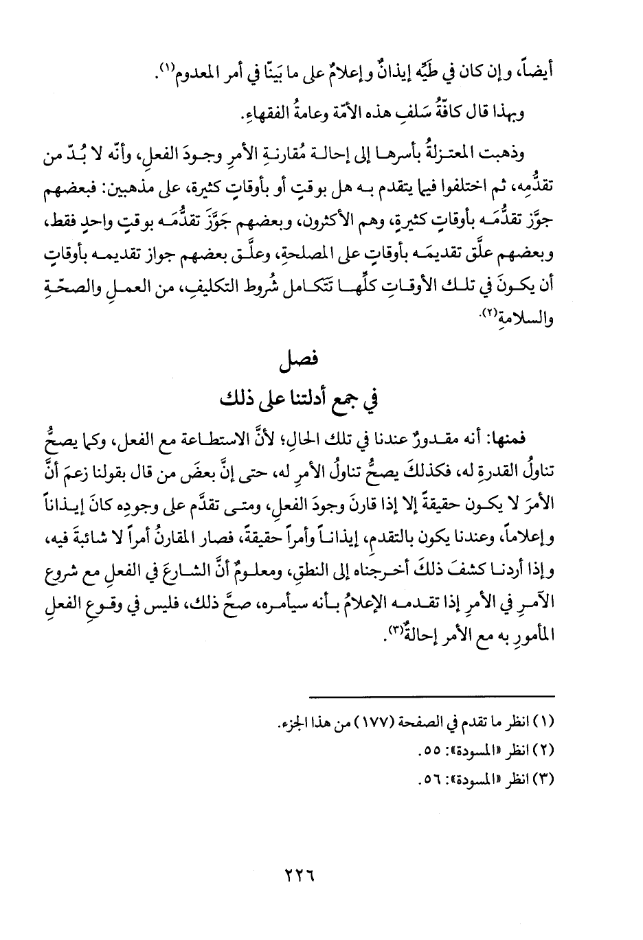 فمنها: أنه مقدورٌ عندنا في تلك الحالِ؛ لأنَ الاستطاعة مع الفعل، وكما يصحُّ تناولُ القدرةِ له، فكذلكَ يصحُّ تناولُ الأمرِ له، حتى إنَ بعضَ من قال بقولنا زعمَ أنَ الأمرَ لا يكون حقيقةً إلا إذا قارنَ وجودَ الفعلِ، ومتى تقدم على وجودِه كانَ إيذاناً وإعلاماً، وعندنا يكون بالتقدمِ، إيذاناً وأمراً حقيقةً، فصار المقارنُ أمراً لا شائبةَ فيه، وإذا أردنا كشفَ ذلكَ أخرجناه إلى النطقِ، ومعلوم أنَ الشارعَ في الفعلِ مع شروع الآمرِ في الأمرِ إذا تقدمه الإعلامُ بأنه سيأمره، صحَ ذلك، فليس في وقوعِ الفعلِ المأمورِ به مع الأمر إحالةٌ (٣).