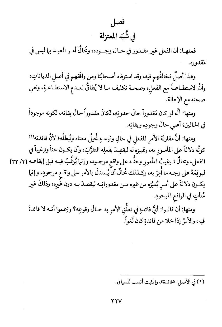 وهذا أصل نخالفُهم فيه، وقد استوفاه أصحابُنا ومن وافَقهم في أصلِ الدياناتِ، وأنَ الاستطاعةَ مع الفعلِ، وصحة تكليف ما لا يُطاقُ لعدمِ الاستطاعةِ، ونفي صحته مع الإحالة.