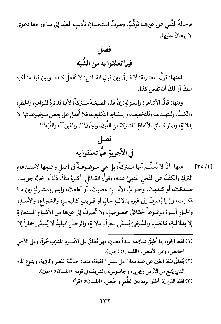ومنها: قولُ الأشاعرةِ والمعتزلةِ: إن هذه الصيغةَ مشتركةٌ؛ لأنها قد تردُ للنزاهةِ، والحظرِ، والكف، وللتهديد، وللتخفيف، وإسقاطِ التكليفِ، فلا تُحمل على بعض موضوعاتها إلا بدلالةٍ، وصار كسائِر الألفاظِ المشتركة من اللون، والجَون (١)، والعَين (٢)، والقُرْء (٣).