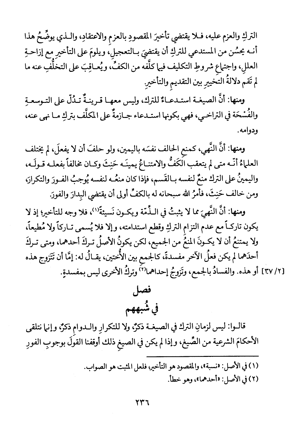 ومنها: أنَّ النَهيَ مما لا يثبتُ في الذمّة ويكون نَسيئةً (١)، فلا وجه للتأخير؛ إذ لا يكون تاركاً مع عدم التزامِ التركِ وقطع استدامته، وإلا فلا يُسمى تاركاً ولا مُطيعاً، ولا يمتنعُ أن لا يكونَ المنعُ من الجميع، لكن يكونُ الأصلُ تركَ أحدهما، ومتى تركَ أحدَهما لم يكن فعلُ الآخر مفسدة، كالجمعِ بين الأختين، يقالُ له: إما أن تتزوج هذه أو هذه. والفسادُ بالجمع، وتَزوجُ إحداهما (٢) وتركُ الأخرى ليس بمفسدةٍ.