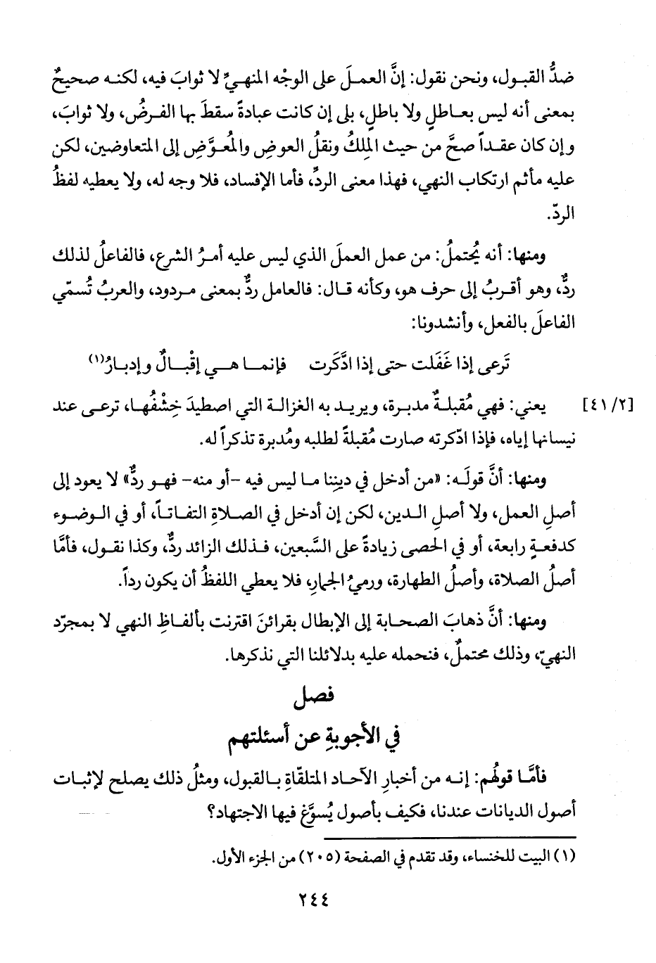 ضدُّ القبول، ونحن نقول: إنَ العملَ على الوجْه المنهيَّ لا ثوابَ فيه، لكنه صحيح بمعنى أنه ليس بعاطلٍ ولا باطلٍ، بلى إن كانت عبادةً سقطَ بها الفرضُ، ولا ثوابَ، وإن كان عقداً صحَ من حيث المِلكُ ونقلُ العوضِ والمُعوّضِ إلى المتعاوضين، لكن عليه مأثم ارتكاب النهي، فهذا معنى الرد، فأما الإفساد، فلا وجه له، ولا يعطيه لفظُ الردّ.