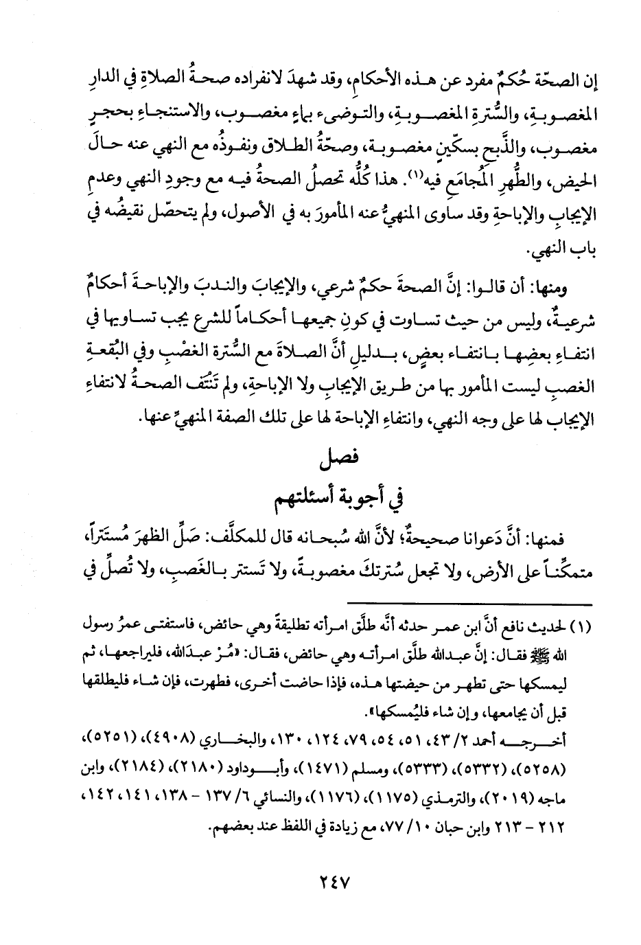 إن الصحّة حُكم مفرد عن هذه الأحكامِ، وقد شهدَ لانفراده صحةُ الصلاةِ في الدارِ المغصوبةِ، والسترةِ المغصوبةِ، والتوضىء بماءِ مغصوب، والاستنجاءِ بحجرِ مغصوب، والذَّبحِ بسكّينِ مغصوبة، وصحّةُ الطلاق ونفوذُه مع النهي عنه حالَ الحيض، والطُّهرِ المُجامَعِ فيه (١). هذا كُله تحصلُ الصحةُ فيه مع وجودِ النهي وعدمِ الإيجابِ والإباحةِ وقد ساوى المنهيَّ عنه المأمورَ به في الأصول، ولم يتحصّل نقيضُه في باب النهي.