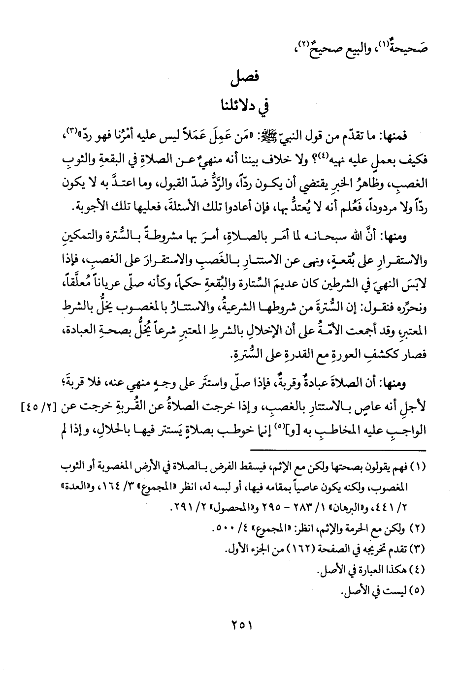 فمنها: ما تقدّم من قول النبيّ صلى الله عليه وسلم:" مَن عَمِلَ عَمَلاَ ليس عليه أمْرُنا فهو ردّ" (٣)، فكيف بعملٍ عليه نهيه (٤)؟ ولا خلاف بيننا أنه منهي عن الصلاةِ في البقعةِ والثوبِ الغصبِ، وظاهرُ الخبرِ يقتضى أن يكون ردّاً، والردُّ ضدّ القبول، وما اعتد به لا يكون ردّاً ولا مردوداً، فَعُلم أنه لا يُعتدُ بها، فإن أعادوا تلك الأسئلةَ، فعليها تلك الأجوبة.