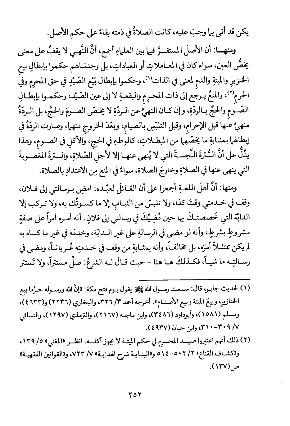 ومنها: أن الأصلَ المستقرَّ فيما بين العلماءِ أجمع، أنَ النهي لا يقفُ على معنى يخصُّ العين، سواء كان في المعاملاتِ أو العباداتِ، بل وجدناهم حكموا بإبطالِ بيع الخنزيرِ والميتةِ والدمِ لمعنى في الذات (١)، وحكموا بإبطال بَيعْ الصّيْدِ في حق المحرِم وفي الحرمِ (٢)، والمنعُ يرجع إلى ذات المحرِمِ والبقعةِ لا إلى عين الصّيْد، وحكموا بإبطالِ الصّومِ والحجِّ بالردّةِ، وإن كان النهيُ عن الردّةِ لا يختصّ الصومَ والحجَّ، بل الردّةُ منهيٌ عنها قبل الإحرامِ، وقبل التلبّسِ بالصيامِ، وبعْدَ الخروجِ منهما، وصارت الردّةُ في إبطالهما بمثابةِ ما يخصّهما من المبطلاتِ، كالوطءِ في الحجِ، والأكلِ في الصومِ، وهذا يدُلُّ على أنَّ السُّترةَ النَّجسةَ التي لا يُنهى عنها إلا لأجلِ الصّلاةِ، والسترةَ المغصوبةَ التي ينهى عنها في الصلاةِ وخارجَ الصلاة، سواءفي المنع مِن الاعتدادِ بالصلاة.