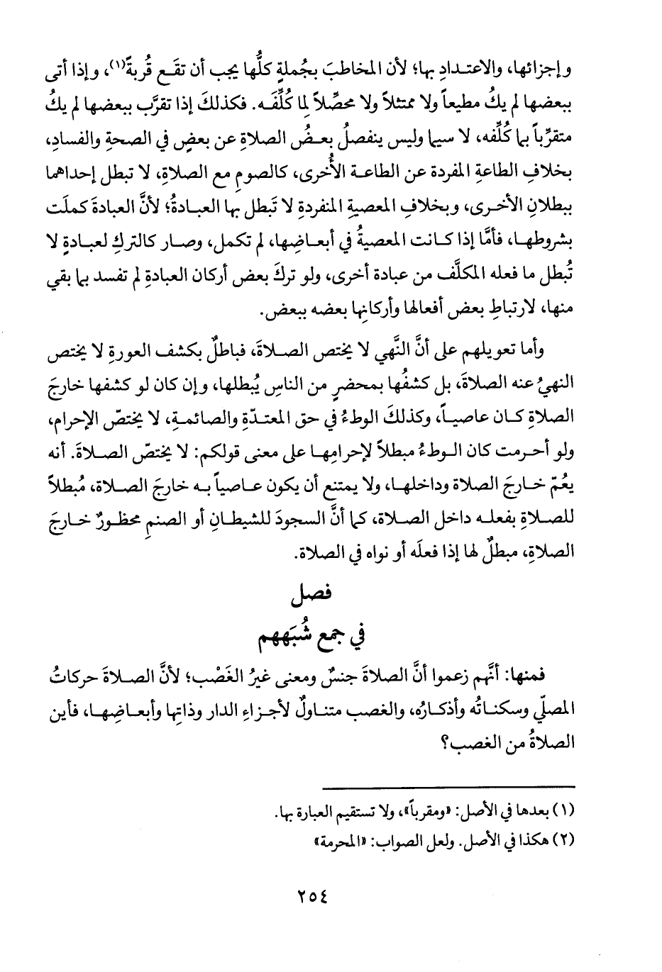 فمنها: أنَهم زعموا أنَ الصلاةَ جنس ومعنى غيرُ الغَصْب؛ لأنَّ الصلاةَ حركاتُ المصلّي وسكناتُه وأذكارُه، والغصب متناولٌ لأجزاءِ الدار وذاتِها وأبعاضِها، فأين الصلاةُ من الغصب؟
