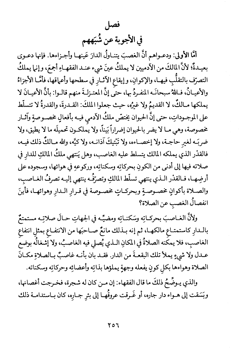 أمَّا الأولى: ودعواهم أنَ الغصبَ يتناولُ الدارَ عَينها وأجزاءها. فإنها دعوى بعيدةٌ؛ لأن المالكَ من الآدميين لا يملكُ عينَ شيء عند الفقهاءِ أجمعَ، وإنما يملكُ التصرّف بالتقلبِ فيها، والإكوانِ، وإيقاعِ الآثارِ في سطحها وأعماقها، فأما الأجزاءُ والأعيانُ، فاللهُ سبحانَه المنفردُ بها، حتى إنَ المعتزلةَ منهم قالوا: بأنَّ الأعيانَ لا يملكها مالكٌ، لا القديمُ ولا غيرُه، حيث جعلوا الملكَ: القدرةَ، والقدرةُ لا تتسلّط على الموجوداتِ، حتى إنَ الحيوان يختصّ ملكُ الآدميِ فيه بأفعالٍ مخصوصةٍ وآثار مخصوصة، وهي ما لا يضر بالحيوان إضراراً بَيناً، ولا يملكون تحميلَه ما لا يطيق، ولا ضربَه لغيرِ حاجة، ولا إخصاءه، ولا تَبْتيكَ آذانه، ولا كيَّه، والله مالك ذلك فيه، فالقدْر الذي يملكه المالك يتسلط عليه الغاصب، وهل يَنتهي ملكُ المالكِ للدارِ في صلاته فيها إلى أدنى من الكونِ بحركاتِه وسكناتِه، وركوعهِ في هوائها، وسجوده على أرضِها، فالقدْر الذي ينتهي تسلّط المالكِ وتصرّفُه ينتهي إليه تصرفُ الغاصبِ، والصلاة بأكوانٍ مخصوصةٍ وبحركاتٍ مخصوصة في قرارِ الدارِ وهوائها، فأينَ انفصالُ الغصبِ عن الصلاة؟