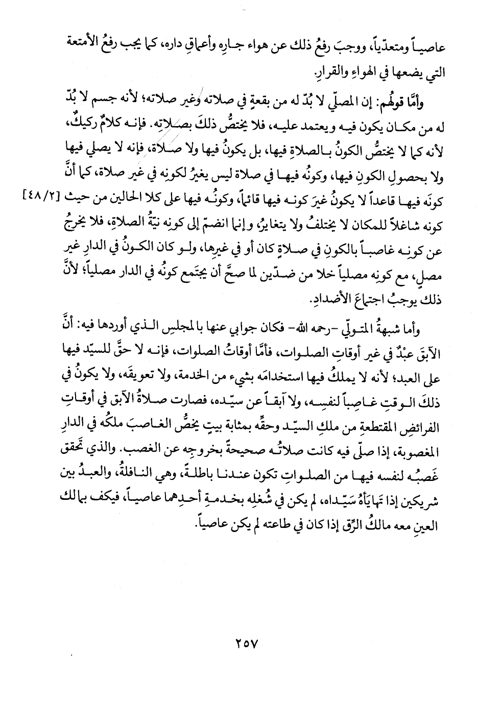 وأمَّا قولُهم: إن المصلي لا بُدّ له من بقعةٍ في صلاته؛ وغير صلاته؛ لأنه جسم لا بُدّ له من مكان يكون فيه ويعتمد عليه، فلا يختصُّ ذلكَ بصَلاتِه. فإنه كلامٌ ركيكٌ، لأنه كما لا يختضُ الكونُ بالصلاةِ فيها، بل يكونُ فيها ولا صلاة، فإنه لا يصلي فيها ولا بحصولِ الكونِ فيها، وكونُه فيها في صلاة ليس يغيرُ لكونه في غير صلاة، كما أنَ كونَه فيها قاعداً لا يكونُ غيرَ كونه فيها قائماً، وكونُه فيها على كلا الحالين من حيث كونه شاغلاً للمكان لا يختلفُ ولا يتغايرُ، وإنما انضمّ إلى كونه نيّةُ الصلاةِ، فلا يخرجُ عن كونه غاصباً بالكونِ في صلاةٍ كان أو في غيرِها، ولو كان الكونُ في الدارِ غير مصلٍ، مع كونه مصلياً خلا من ضدّين لما صحَ أن يجتَمع كونُه في الدار مصلياً؛ لأنَّ ذلك يوجبُ اجتماعَ الأضدادِ.