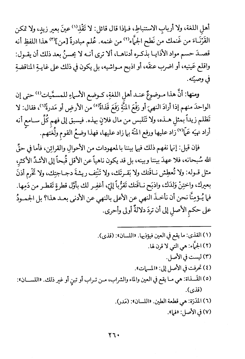أهلِ اللغة، ولا أربابِ الاستنباطِ، فإذا قال قائل: لا تَقْذِ (١) عينَ بعير زيدٍ، ولا تمكن القَرْنَاءَ من غَنمك من نَطح الجماء (٢) من غنمه. عُلم مبادرةَ [من] (٣) هذا اللفظِ أنه قصدَ حسم مواد الأذايا بذكره أدناها، ألا ترى أنه لا يحسنُ بعد ذلك أن يقول: واقلع عَينيه، أو اضرب عنقَه، أو اذبح مواشيه، بل يكون في ذلك على غايةِ المناقضةِ في وصيّته.
