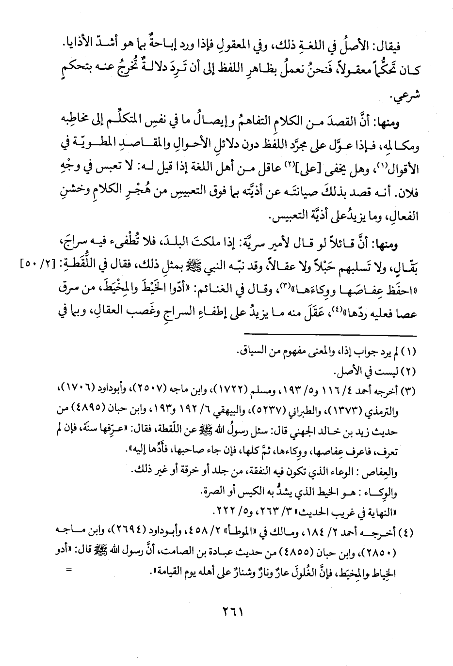 ومنها: أنَّ قائلاً لو قال لأمير سريَّة: إذا ملكتَ البلدَ، فلا تُطْفىء فيه سراجَ، بقّالٍ، ولا تَسلبهم حَبْلاً ولا عقالاً، وقد نبّه النبي صلى الله عليه وسلم بمثلِ ذلك، فقال في اللُّقَطةِ: "احفَظ عِفاصَها ووِكاءَها" (٣)، وقال في الغنائم: "أدّوا الخَيْطَ والمِخْيَطَ، من سرق عصا فعليه ردّها" (٤)، عَقَلَ منه ما يزيدُ على إطفاءِ السراجِ وغَصب العقالِ، وبما في