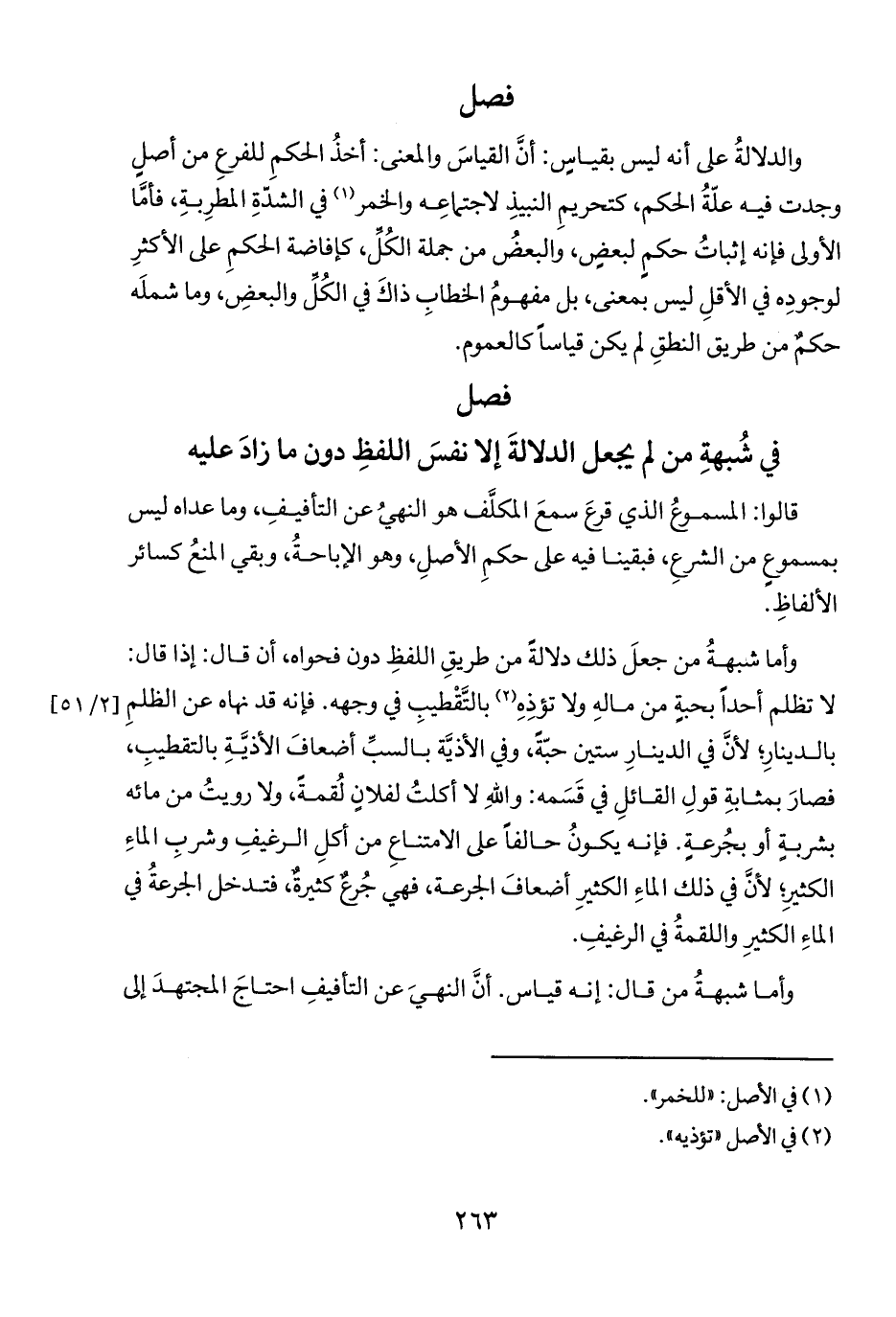 وأما شبهةُ من جعلَ ذلك دلالةً من طريقِ اللفظِ دون فحواه، أن قال: إذا قال: لا تظلم أحداً بحبةٍ من مالهِ ولا تؤذه (٢) بالتَّقْطيبِ في وجهه. فإنه قد نهاه عن الظلمِ بالدينار لأنَّ في الدينارِ ستين حبّةً، وفي الأذيَّة بالسبِّ أضعافَ الأذيَّةِ بالتقطيبِ، فصارَ بمثابةِ قولِ القائلِ في قَسَمه: واللهِ لا أكلتُ لفلان لُقمة، ولا رويتُ من مائه بشربةٍ أو بجُرعةٍ. فإنه يكونُ حالفاً على الامتناعِ من أكلِ الرغيفِ وشربِ الماءِ الكثيرِ؛ لأنَّ في ذلك الماءِ الكثيرِ أضعافَ الجرعة، فهي جُرعٌ كثيرةٌ، فتدخل الجرعةُ في الماءِ الكثيرِ واللقمةُ في الرغيفِ.