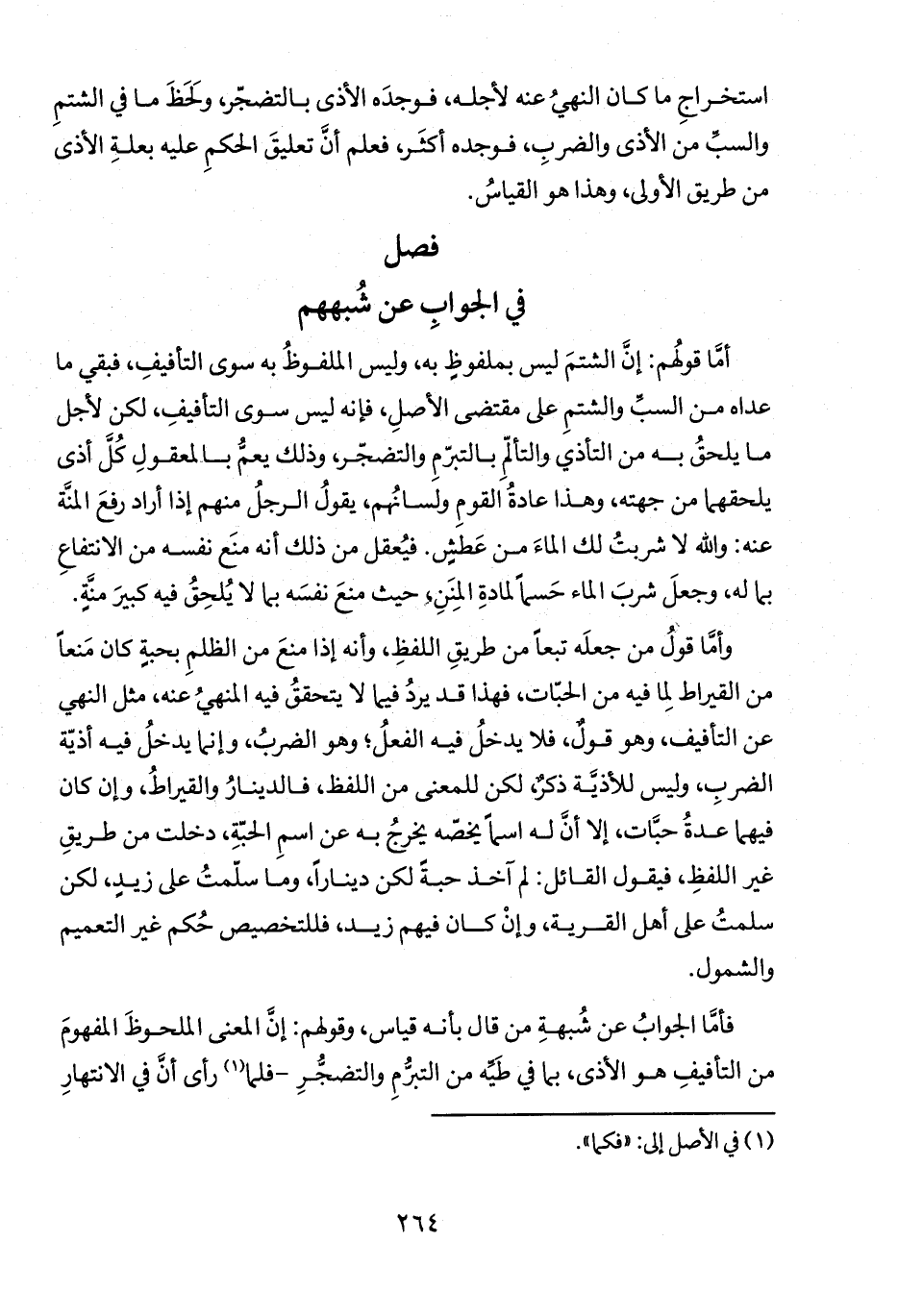 فأما الجوابُ عن شُبهةِ من قال بأنه قياس، وقولهم: إن المعنى الملحوظَ المفهومَ من التأفيفِ هو الأذى، بما في طَيِّه من التبرُمِ والتضخرِ-فلما (١) رأى أنَ في الانتهارِ