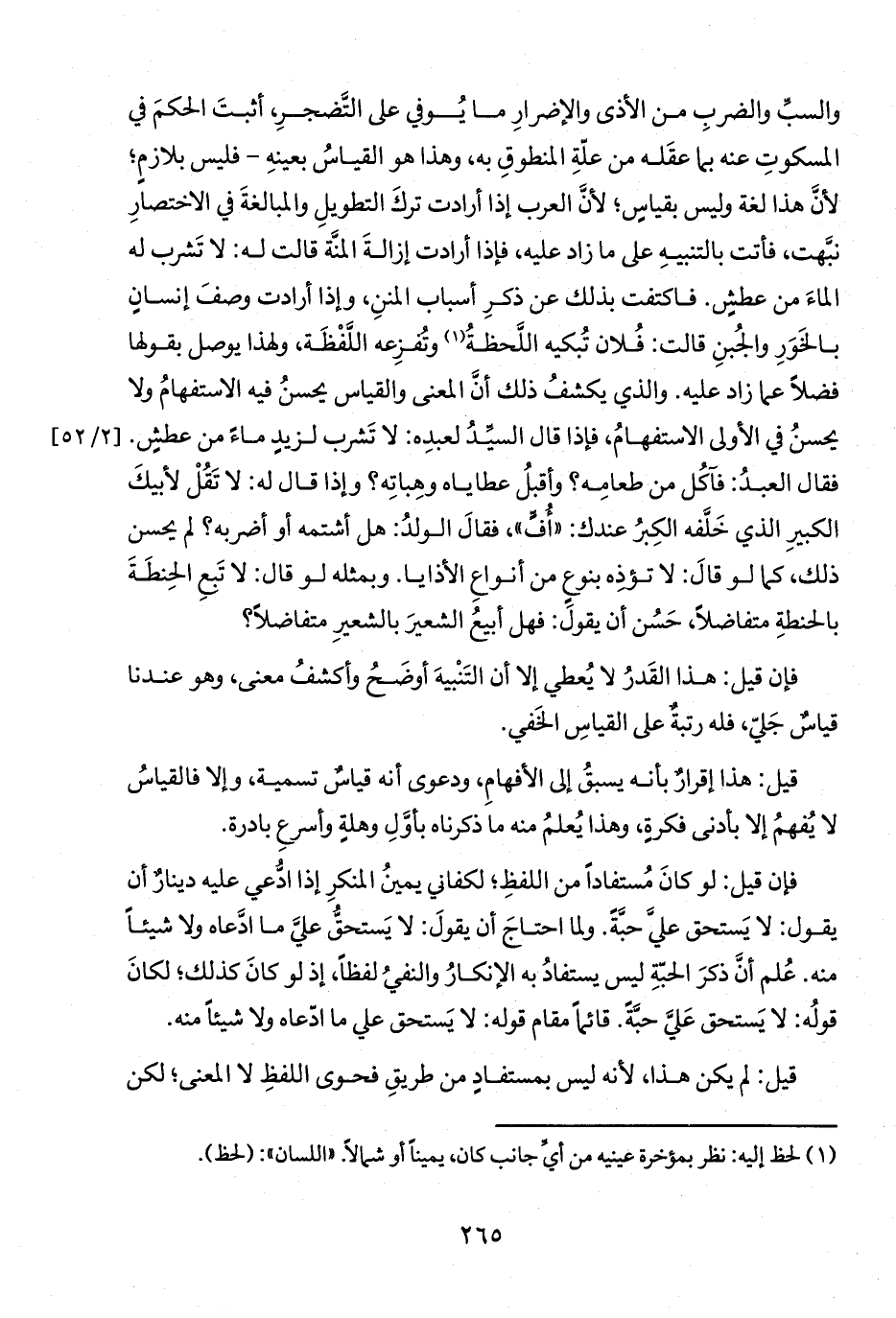 والسبِّ والضربِ من الأذى والإضرارِ ما يُوفي على التَّضجرِ، أثبتَ الحكمَ في المسكوتِ عنه بما عقَله من علّةِ المنطوقِ به، وهذا هو القياسُ بعينهِ -فليس بلازمٍ؛ لأنَّ هذا لغة وليس بقياسٍ؛ لأنَّ العرب إذا أرادت تركَ التطويلِ والمبالغةَ في الاختصارِ نبَّهت، فأتت بالتنبيهِ على ما زاد عليه، فإذا أرادت إزالةَ المنَّة قالت له: لا تَشرب له الماءَ من عطشٍ. فاكتفت بذلك عن ذكرِ أسباب المننِ، وإذا أرادت وصفَ إنسانٍ بالخَوَرِ والجُبنِ قالت: فُلان تُبكيه اللَّحظةُ (١) وتفزِعه اللفْظَة، ولهذا يوصل بقولها فضلاً عما زاد عليه. والذي يكشفُ ذلك أنَّ المعنى والقياس يحسنُ فيه الاستفهامُ ولا يحسنُ في الأولى الاستفهامُ، فإذا قال السيدُ لعبدِه: لا تَشرب لزيدٍ ماءً من عطشٍ.