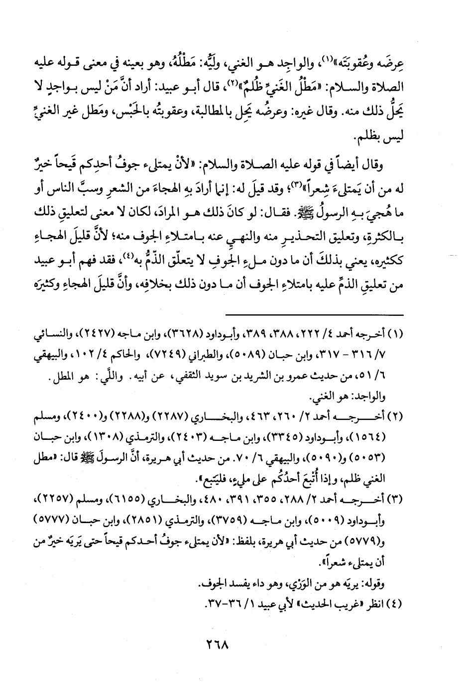 وقال أيضاً في قوله عليه الصلاة والسلام: "لأنْ يمتلىء جوفُ أحدِكم قَيحاً خيرٌ له من أن يَمتلىءَ شِعراً" (٣)؛ وقد قيلَ له: إنما أرادَ بهِ الهجاءَ من الشعرِ وسب الناس أو ما هُجيَ بهِ الرسولُ صلى الله عليه وسلم. فقال: لو كانَ ذلك هو المرادَ، لكان لا معنى لتعليقِ ذلك بالكثرةِ، وتعليق التحذيرِ منه والنهيِ عنه بامتلاءِ الجوف منه؛ لأنَّ قليلَ الهجاءِ ككثيره، يعني بذلكَ أن ما دون ملءِ الجوفِ لا يتعلّق الذّمُ به (٤)، فقد فهم أبو عبيد من تعليقِ الذَم عليه بامتلاءِ الجوف أن ما دون ذلك بخلافِه، وأنَّ قليلَ الهجاءِ وكثيرَه