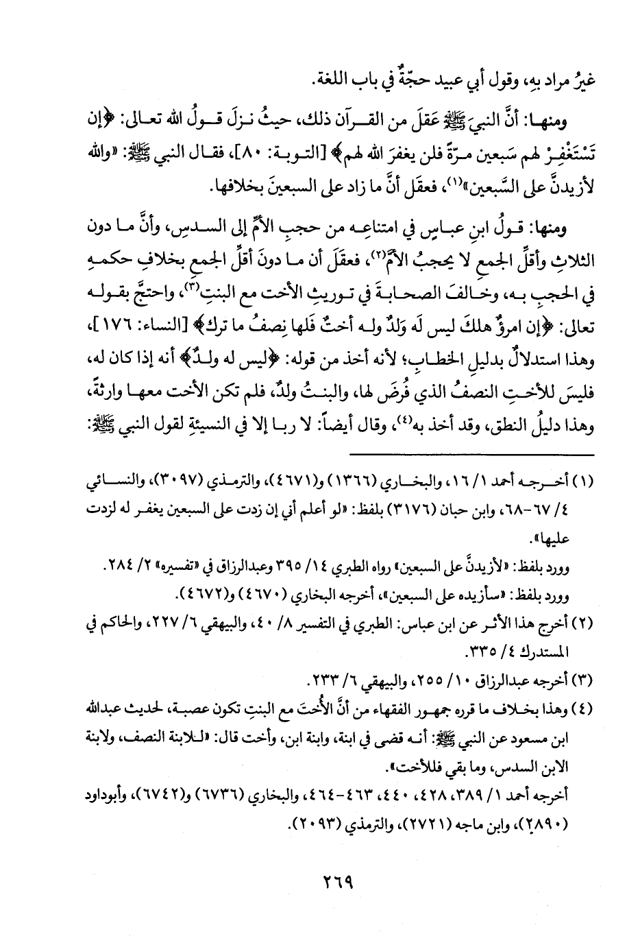 ومنها: قولُ ابنِ عباس في امتناعِه من حجبِ الام إلى السدسِ، وأنَ ما دون الثلاثِ وأقل الجمعِ لا يحجبُ الأم (٢)، فعقَلَ أن ما دونَ أقل الجمعِ بخلافِ حكمهِ في الحجبِ به، وخالفَ الصحابةَ في توريثِ الأخت مع البنتِ (٣)، واحتجَّ بقوله تعالى: {إِنِ امْرُؤٌ هَلَكَ لَيْسَ لَهُ وَلَدٌ وَلَهُ أُخْتٌ فَلَهَا نِصْفُ مَا تَرَكَ} [النساء: ١٧٦] وهذا استدلالٌ بدليلِ الخطابِ؛ لأنه أخذ من قوله: {لَيْسَ لَهُ وَلَدٌ} أنه إذا كان له، فليسَ للأختِ النصفُ الذي فُرضَ لها، والبنتُ ولد فلم تكن الأخت معها وارثةً، وهذا دليلُ النطق، وقد أخذ به (٤)، وقال أيضاً: لا ربا إلا في النسيئةِ لقول النبي - صلى الله عليه وسلم -: