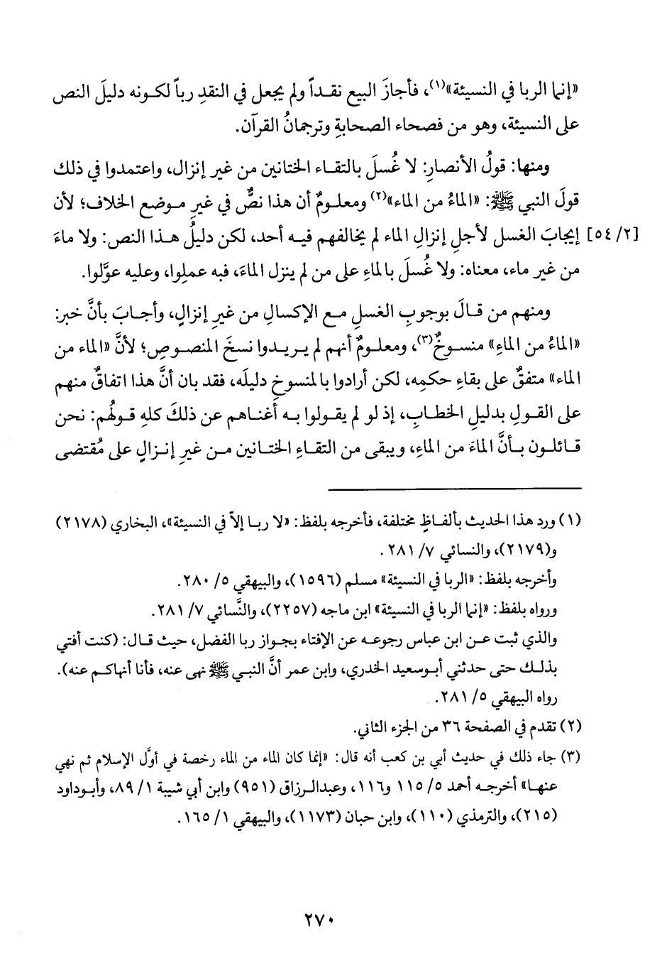 (١) ورد هذا الحديث بألفاظ مختلفة، فأخرجه بلفظ: "لا ربا إلاّ في النسيئة"، البخاري (٢١٧٨) و (٢١٧٩)، والنسائي ٧/ ٢٨١.