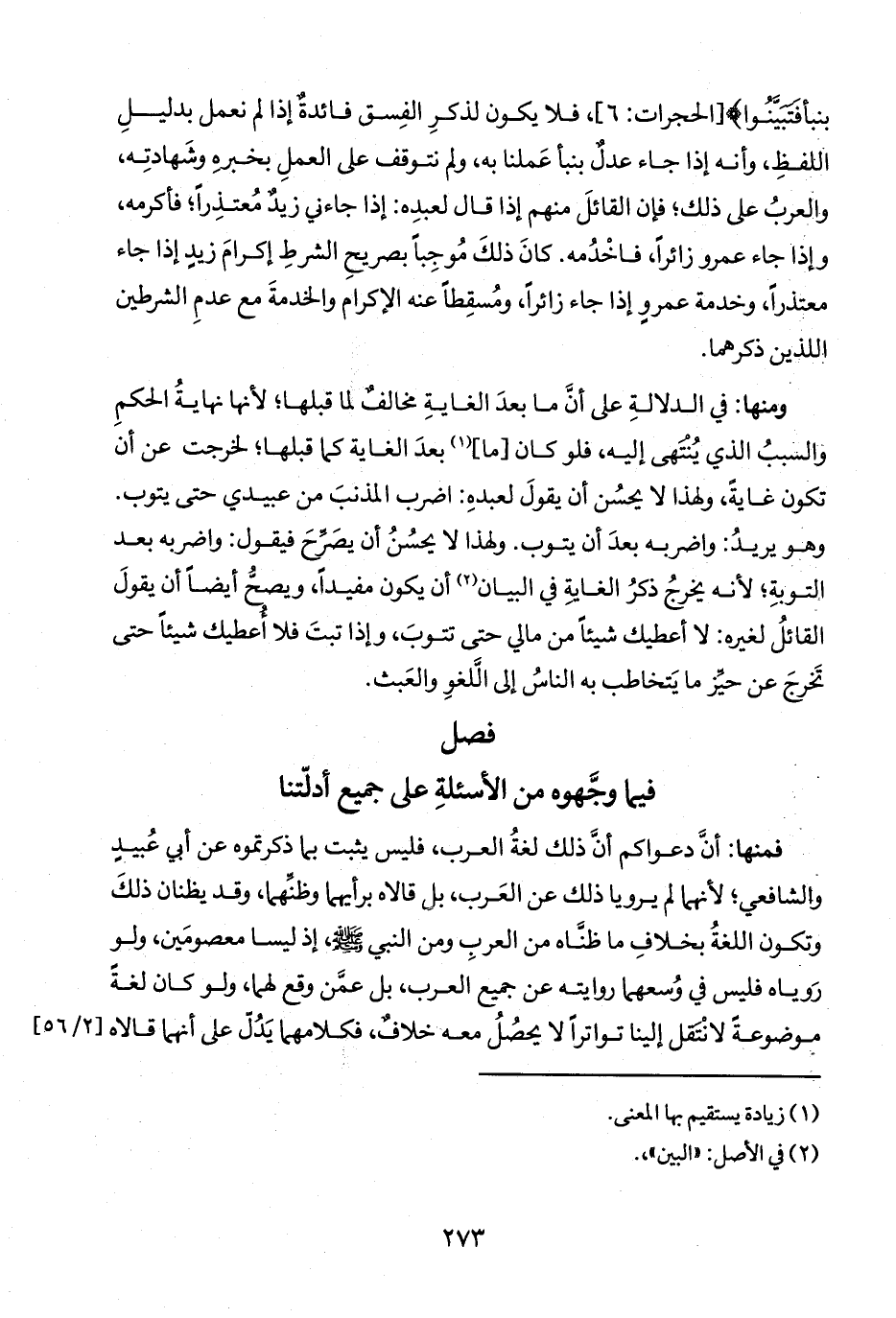 فمنها: أنَّ دعواكم أن ذلك لغةُ العرب، فليس يثبت بما ذكرتموه عن أبي عُبيدٍ والشافعي؛ لأنهما لم يرويا ذلك عن العَرب، بل، قالاه برأيهما وظنهما، وقد يظنان ذلكَ وتكون اللغةُ بخلافِ ما ظنَاه من العربِ ومن النبي صلى الله عليه وسلم، إذ ليسا معصومَين، ولو رَوياه فليس في وُسعهما روايته عن جميع العرب، بل عمَّن وقع لهما، ولو كان لغةً موضوعةً لاتنقل إلينا تواتراً لا يحصُلُ معه خلاف، فكلامهما يَدُل على أنهما قالاه