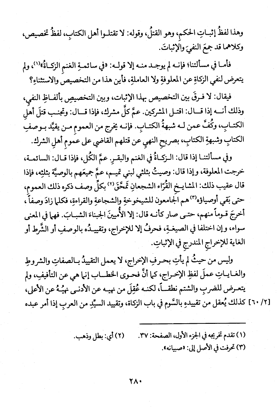 وليس من حيثُ لم يأتِ بحرفِ الإخراج، لا يعمل التقييدُ بالصفاتِ والشروطِ والغايات عملَ لفظِ الإخراج، كما أنَ فحوى الخطاب إنما هي عن التأفيفِ، ولم يتعرض للضربِ والشتم نطقاً، لكنه عُقِلَ من نهيه عن الأدنى نهيُهُ عن الأعلى، كذلك يُعقل من تقييدهِ بالشَوم في باب الزكاة، وتقييد السيدِ من العربِ إذا أمر عبده