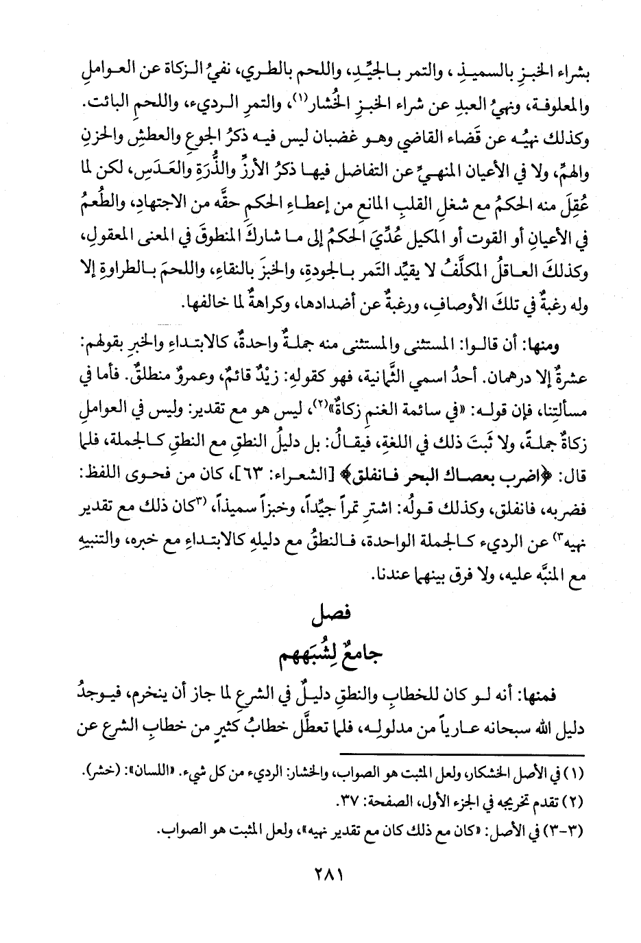 ومنها: أن قالوا: المستثنى والمستثنى منه جملةٌ واحدةٌ، كالابتداءِ والخبرِ بقولهم: عشرةٌ إلا درهمان. أحدُ اسمي الثمانية، فهو كقولهِ: زيْدٌ قائمٌ، وعمروٌ منطلقٌ. فأما في مسألتِنا، فمن قوله: "في سائمة الغنمِ زكاةٌ" (٢)، ليس هو مع تقدير وليس في العواملِ زكاةٌ جملةً، ولا ثَبتَ ذلك في اللغةِ، فيقالُ: بل دليلُ النطقِ مع النطقِ كالجملة، فلما قال: {اضْرِبْ بِعَصَاكَ الْبَحْرَ فَانْفَلَقَ} [الشعراء: ٦٣]، كان من فحوى اللفظ: فضربه، فانفلق، وكذلك قولُه: اشترِ تمراً جيداً، وخبزاً سميذاً، (٣ كان ذلك مع تقدير نهيه ٣) عن الرديء كالجملة الواحدة، فالنطقُ مع دليلهِ كالابتداءِ مع خبره، والتنبيهِ مع المنبَّه عليه، ولا فرق بينهما عندنا.