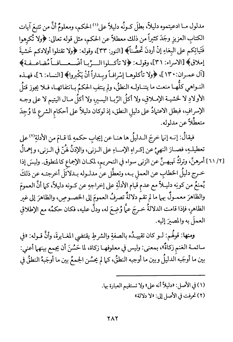 فيقالُ: إنه إنما خرجَ الدليلُ ها هنا عن إيجابِ حكمهِ لما قامَ من الأدلةِ (٢) على تعطيلهِ، فصارَ النهيُ عن إكراهِ الإماءِ على الزنى، والإذنُ لهُن في الزنى، وإهمالُ أمرهنَّ، وتركُ نَهيهنَّ عن الزنى سواء في التحريمِ، لمكان الإجماعِ كالمنطوق. وليسَ إذا خرج دليلُ الخطابِ عن العملِ به، وتعطَّل عن مدلوله بدلائلَ أخرجته عن ذلكَ يُمنعُ من كونه دليلاً مع عدمِ قيام الأدلّةِ على إخراجهِ عن كونه دليلاً، كما أنَّ العمومَ والظاهرَ معمول بهما ما لم تقم دلالة تصرفُ العمومَ إلى الخصوصِ، والظاهرَ إلى غير الظاهرِ، فإذا قامت الدلالةُ خرجَ عمَّا وُضِعَ له، ودلَّ عليه، فكان حكمُه مع الإطلاقِ العملَ به والمصيرَ إليه.