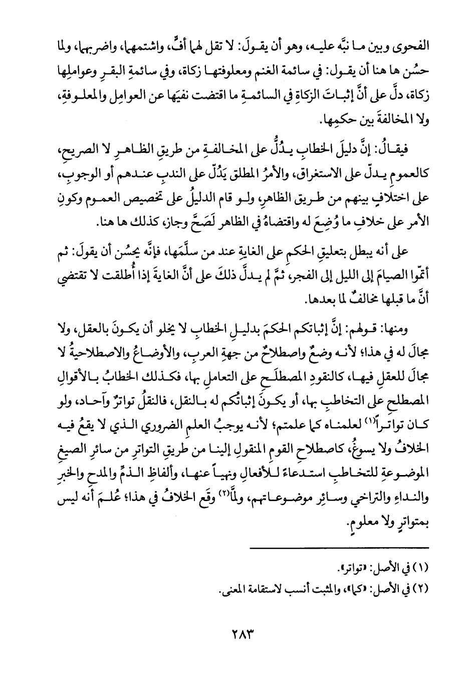 ومنها: قولهم: إنَ إثباتكم الحكمَ بدليلِ الخطابِ لا يخلو أن يكونَ بالعقل، ولا مجالَ له في هذا؛ لأنه وضع واصطلاح من جهةِ العربِ، والأوضاعُ والاصطلاحيةُ لا مجالَ للعقلِ فيها، كالنقودِ المصطلَحِ على التعاملِ بها، فكذلك الخطابُ بالأقوالِ المصطلحِ على التخاطبِ بها، أو يكونَ إثباتكم له بالنقل، فالنقلُ تواتر وآحاد، ولو كان تواتراً (١) لعلمناه كما علمتم؛ لأنه يوجبُ العلمِ الضروري الذي لا يقعُ فيه الخلافُ ولا يسوغُ، كاصطلاحِ القومِ المنقولِ إلينا من طريقِ التواترِ من سائرِ الصيغِ الموضوعةِ للتخاطبِ استدعاءً للأفعالِ ونهياً عنها، وألفاظِ الذم والمدحِ والخبرِ والنداءِ والتراخي وسائِر موضوعاتهم، ولما (٢) وقَع الخلافُ في هذا؛ عُلمَ أنه ليس بمتواترِ ولا معلومِ.