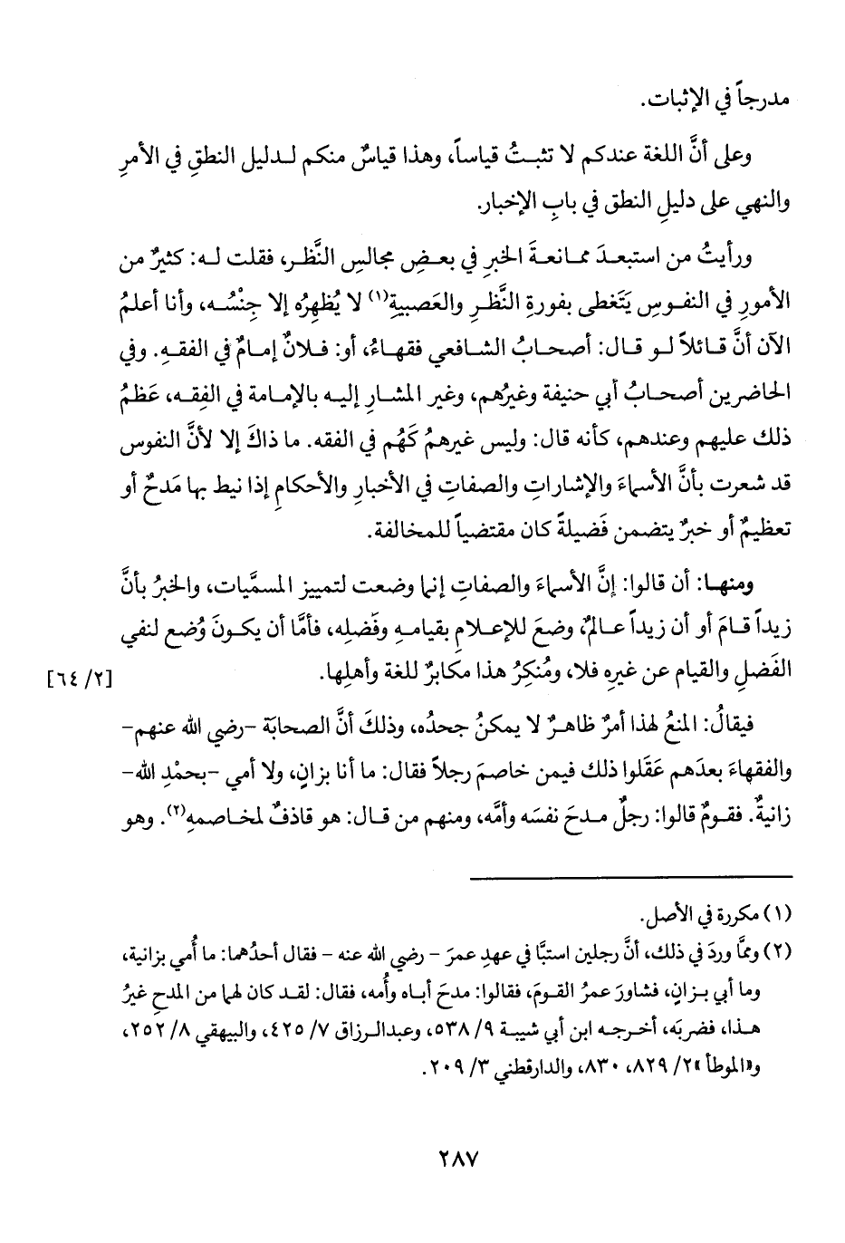 فيقالُ: المنعُ لهذا أمر ظاهرٌ لا يمكنُ جحدُه، وذلكَ أنَ الصحابة- رضي الله عنهم- والفقهاءَ بعدَهم عَقَلوا ذلك فيمن خاصمَ رجلاً فقال: ما أنا بزانٍ، ولا أمي -بحمْدِ الله- زانيةٌ. فقومٌ قالوا: رجلٌ مدحَ نفسَه وأمَّه، ومنهم من قال: هو قاذفٌ لمخاصمهِ (٢). وهو