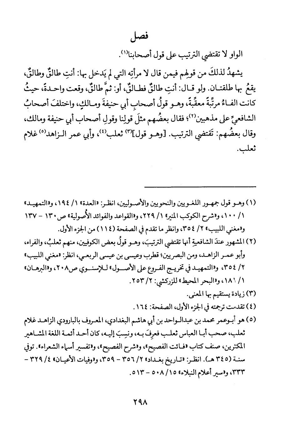 يشهدُ لذلكَ من قولهم فيمن قال لامرأتِه التي لم يَدخل بها: أنتِ طالقٌ وطالقٌ، يقعُ بها طلقتان. ولو قال: أنتِ طالقٌ فطالقٌ، أو: ثمَ طالقٌ، وقعت واحدةً، حيثُ كانت الفاءُ مرتَبةً معقِّبةً، وهو قولُ أصحابِ أبي حنيفةَ ومالكٍ، واختلفَ أصحابُ الشافعيِّ على مذهبين (٢)؛ فقال بعضُهم مثلَ قولنا وقولِ أصحاب أبي حنيفة ومالك، وقال بعضُهم: تَقتضي الترتيب. [وهو قول] (٣) ثعلب (٤)، وأبي عمر الزاهد (٥) غلام ثعلب.