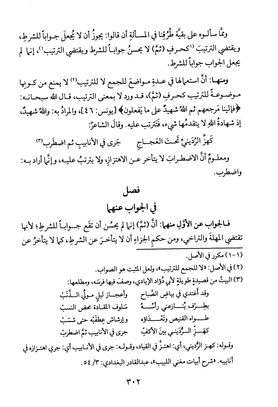 ومنها: أنَ استعمالها في عدةِ مواضعَ للجمع لا للترتيب (٢) لا يمنع من كونِها موضوعةً للترتيب كحرفِ (ثمَّ)، قد ورد لا بمعنى الترتيب، قال الله سبحانه: {فَإِلَيْنَا مَرْجِعُهُمْ ثُمَّ اللَّهُ شَهِيدٌ عَلَى مَا يَفْعَلُونَ} [يونس: ٤٦]، والمرادُ به: واللهُ شهيد، إذ شهادةُ الله لا يتقدمُها شيء، فتَترتب عليه. وقالَ الشاعرُ: